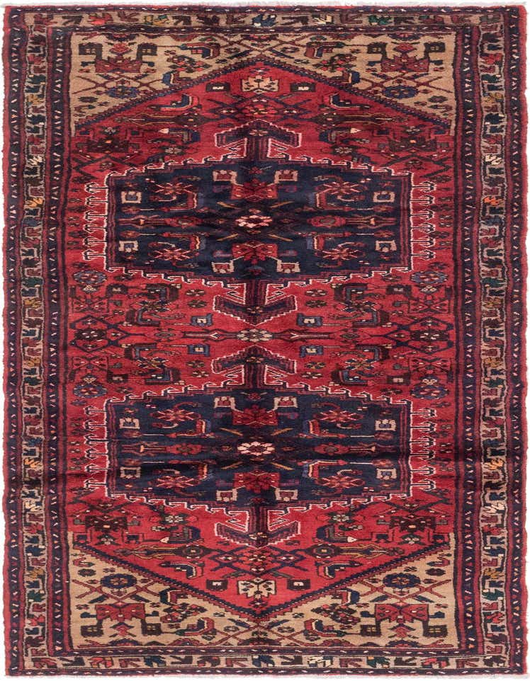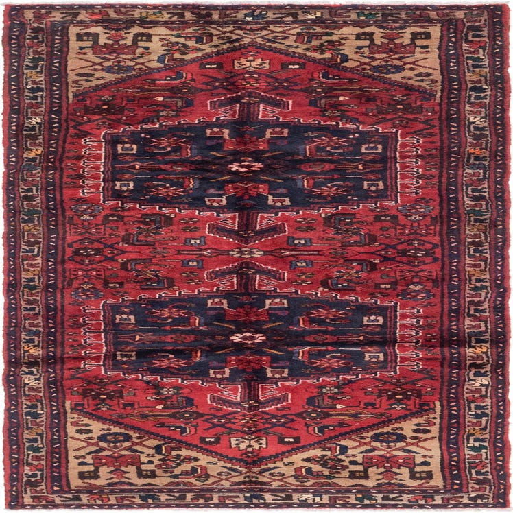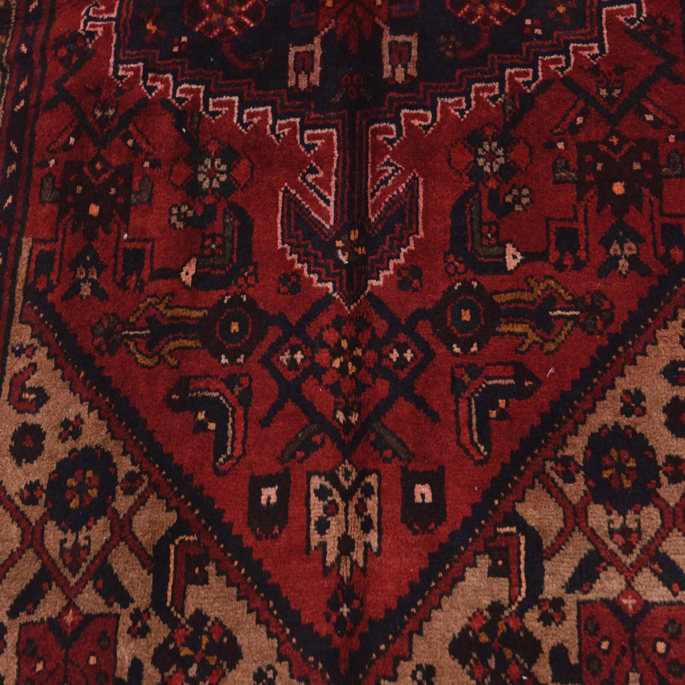 Primary color is Red. Colors in this rug include: Red, Black, Light Brown, Hunter Green, Navy Blue.