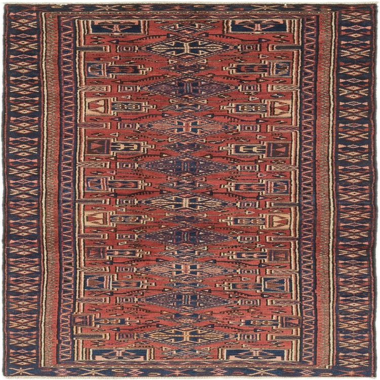 Primary color is Red. Colors in this rug include: Red, Black, Blue, Green, Ivory, Navy Blue, Peach, Orange, Olive.