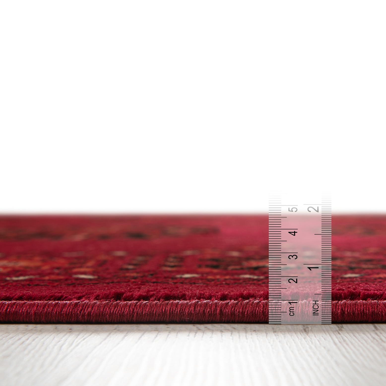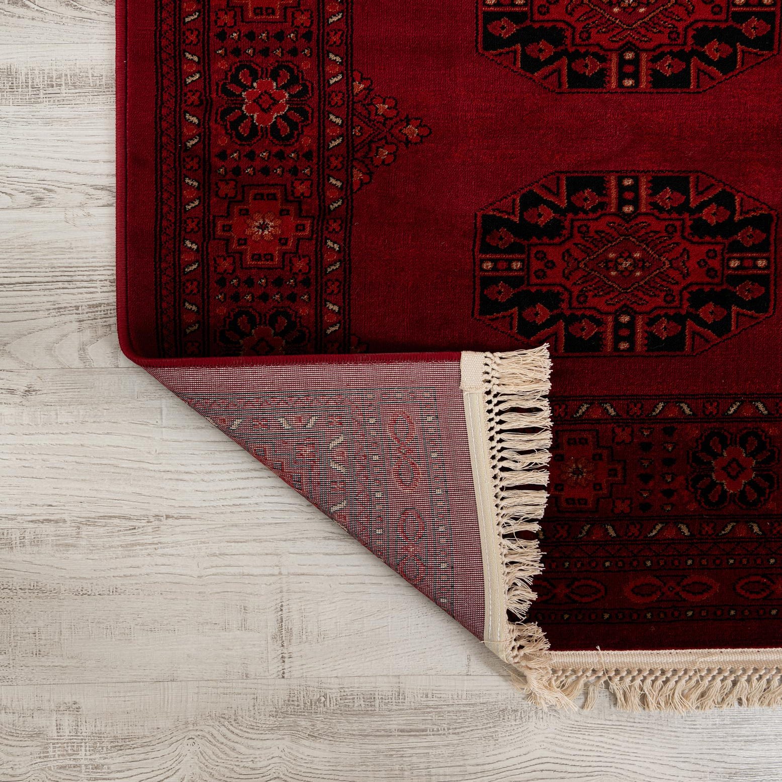 Primary color is Red. Colors in this rug include: Red, Black, Ivory, Orange.