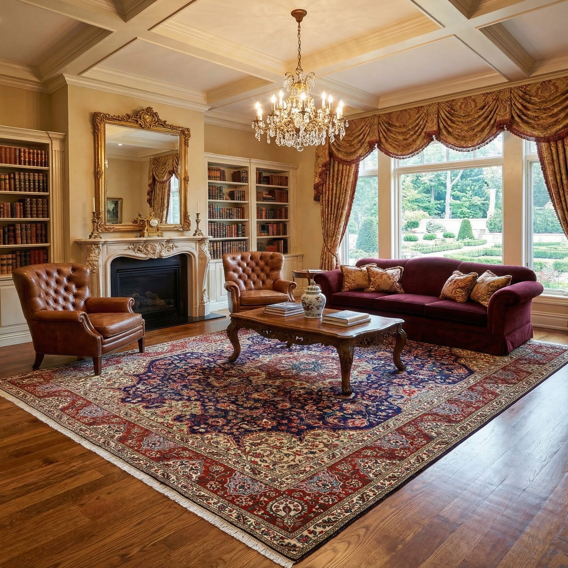 Primary color is Red. Colors in this rug include: Red, Red, Beige, Blue, Brown, Green, Black.