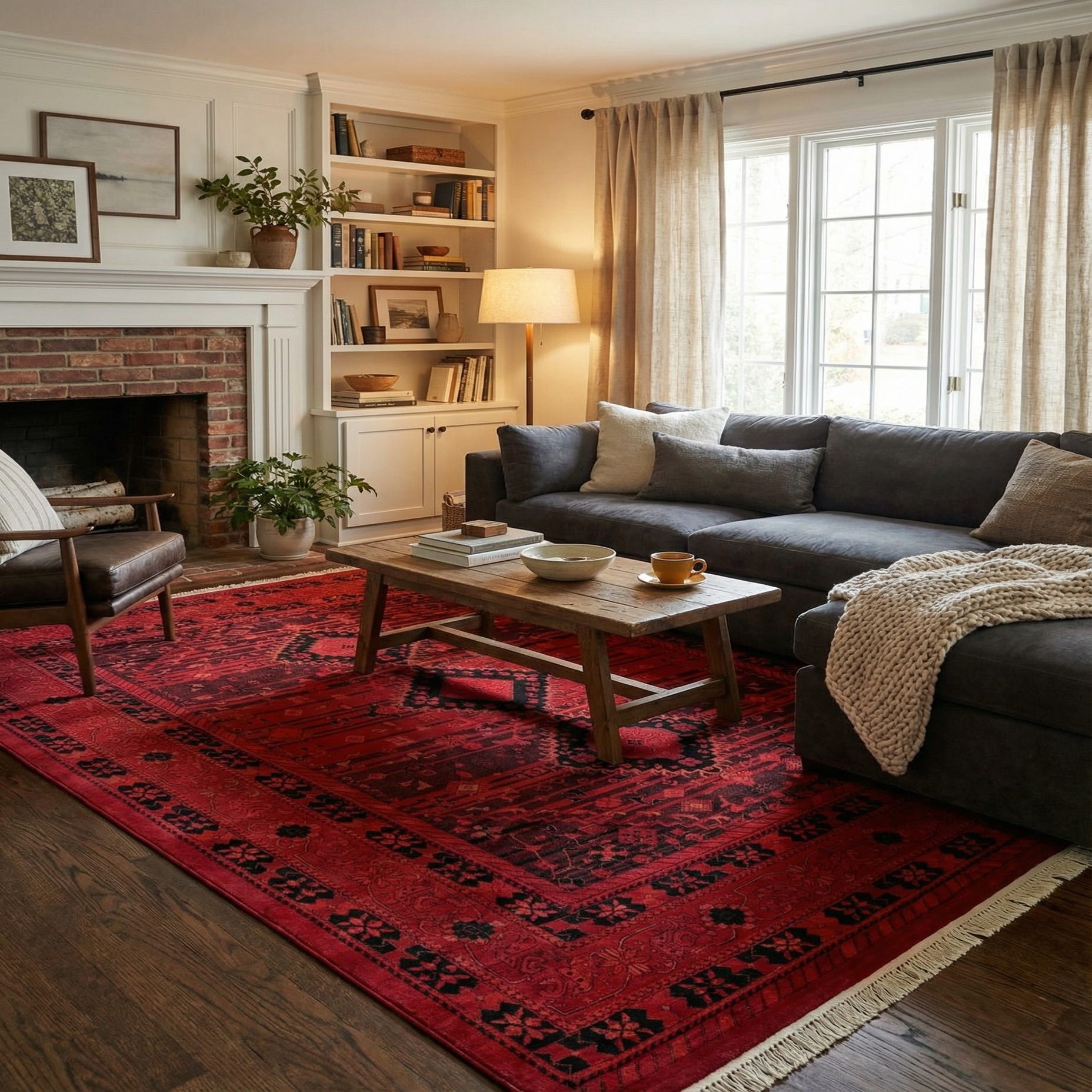 Primary color is Red. Colors in this rug include: Red, Black, Cream, Terracotta.