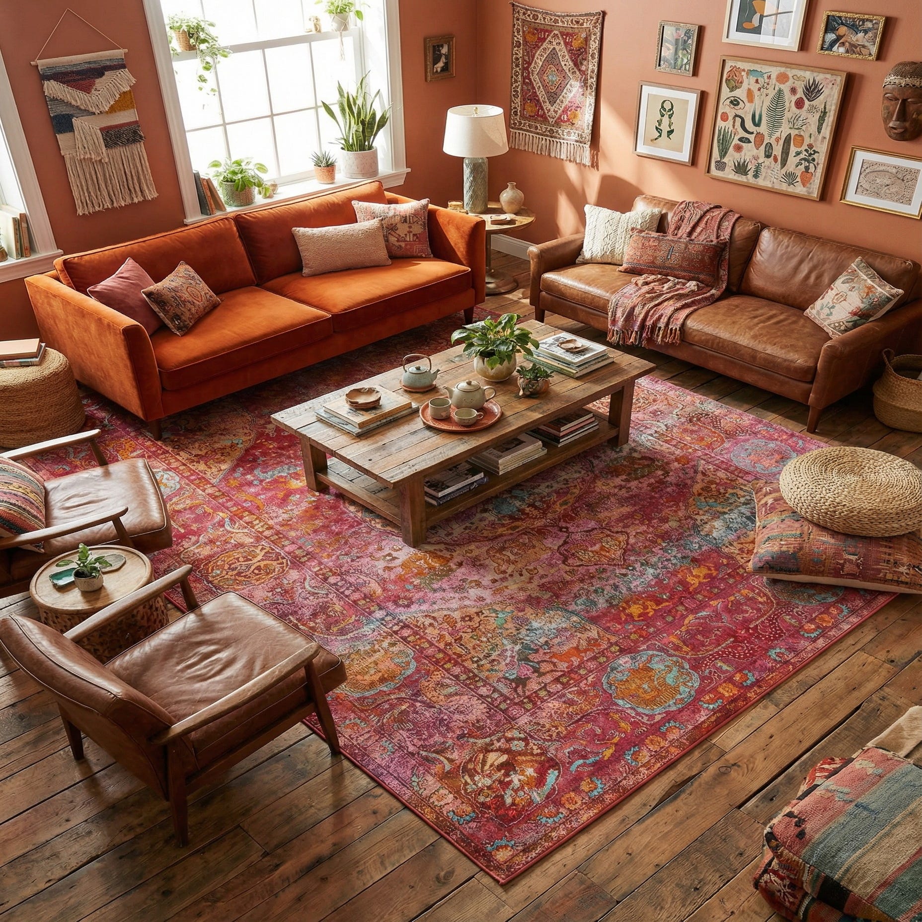 Primary color is Red. Colors in this rug include: Red, Brown, Ivory, Orange, Terracotta, Turquoise, Pink, Violet.