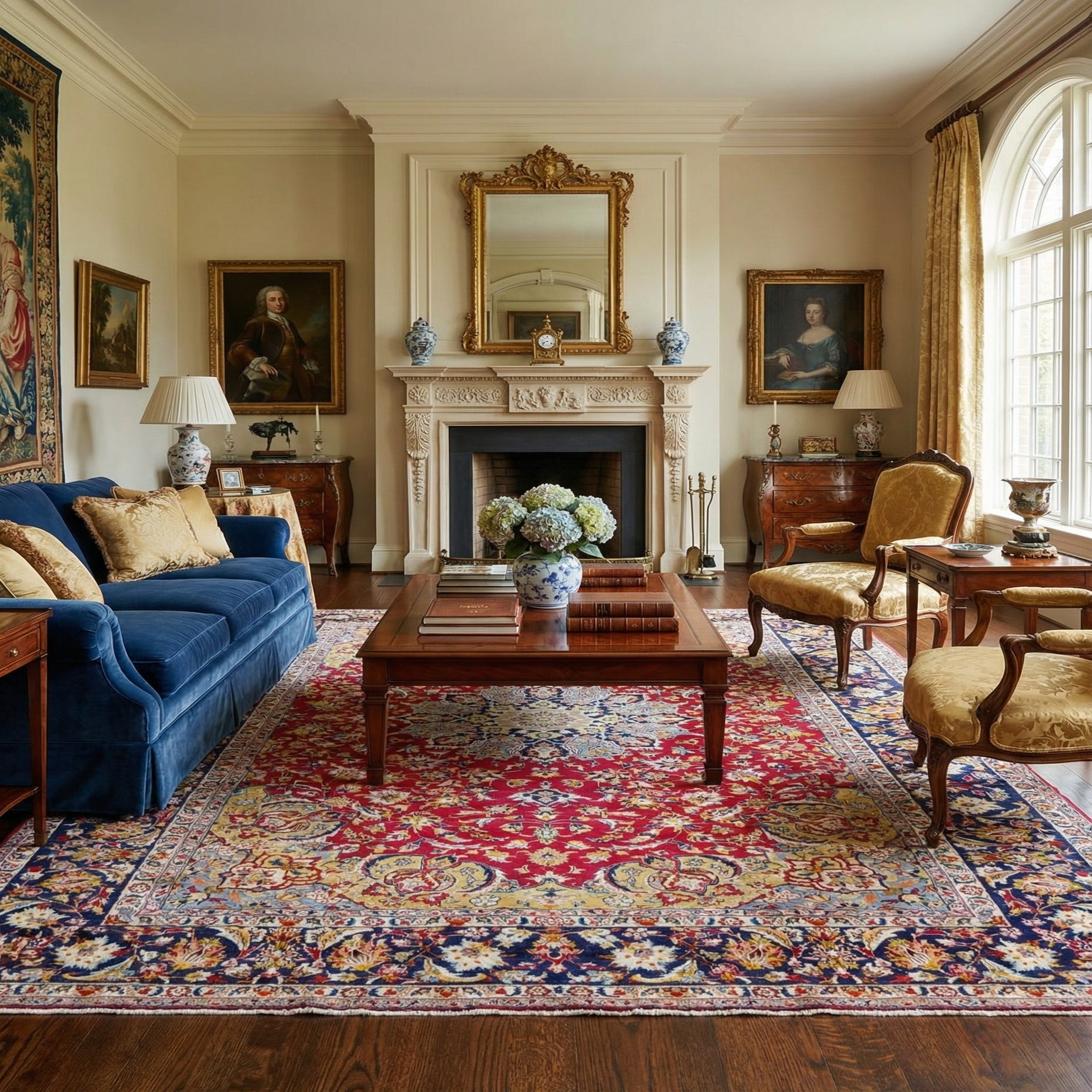 Primary color is Red. Colors in this rug include: Red, Beige, Blue, Brown, Gold, Green, Ivory, Navy Blue.