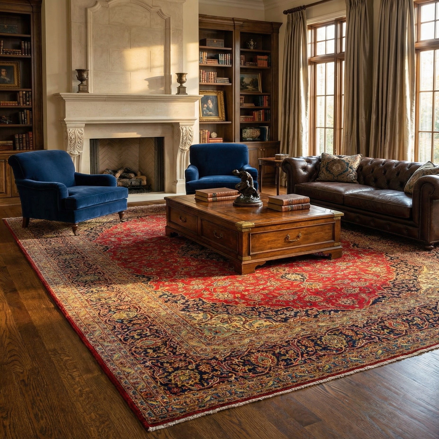 Primary color is Red. Colors in this rug include: Red, Red, Dark Blue, Beige, Olive.