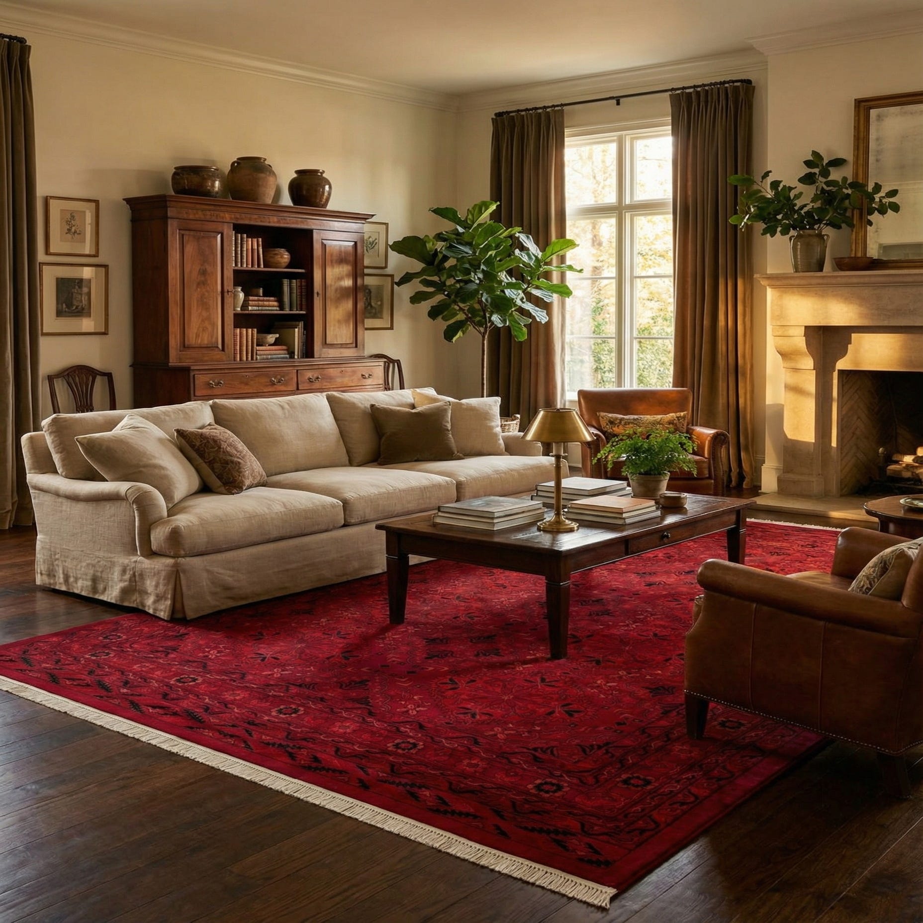 Primary color is Red. Colors in this rug include: Red, Black, Cream, Terracotta.