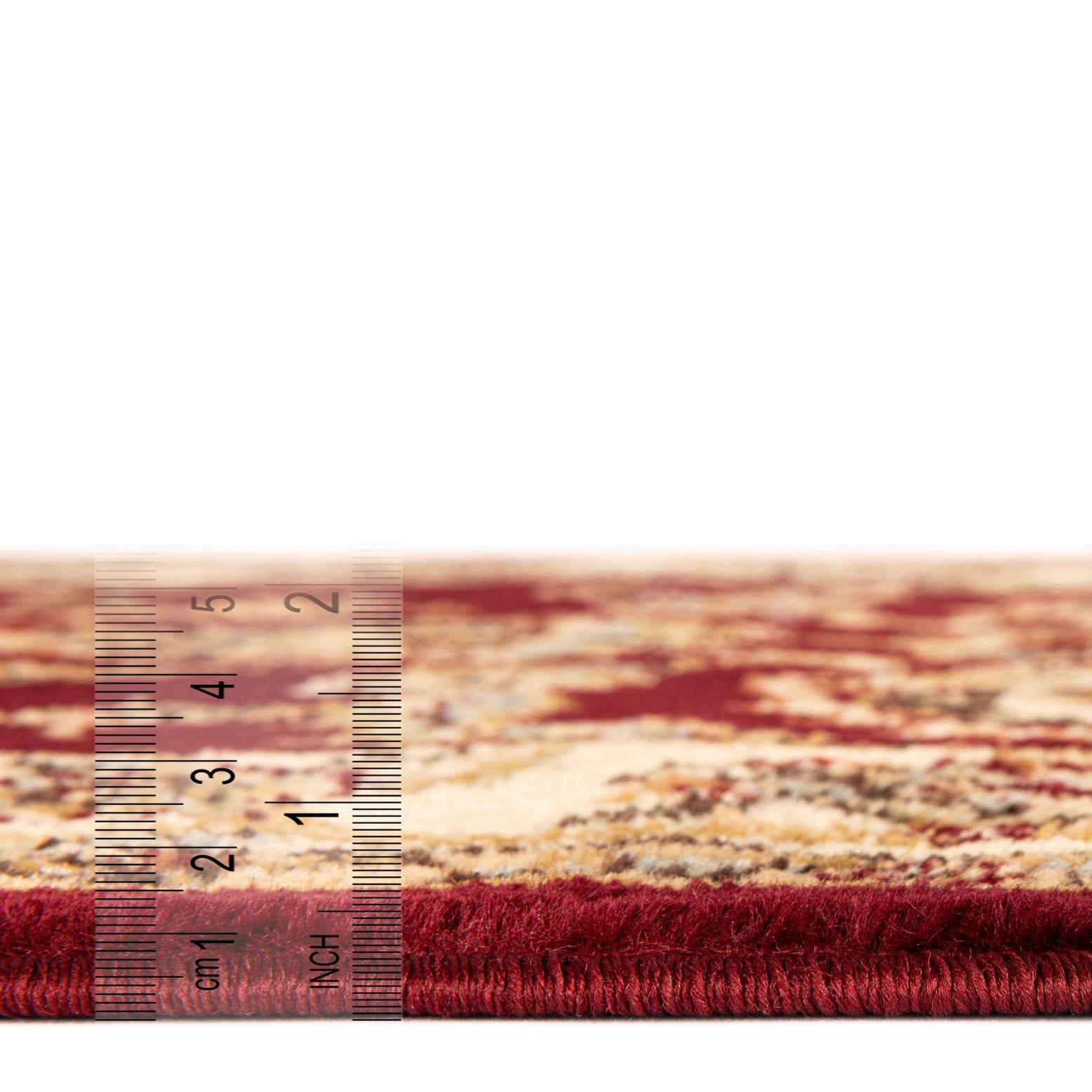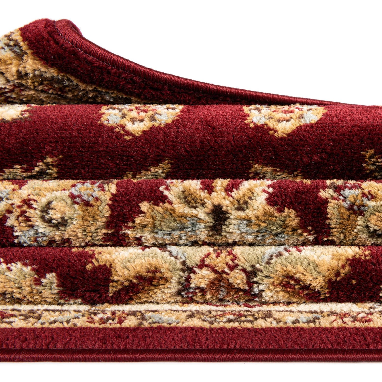 Primary color is Red. Colors in this rug include: Red, Brown, Blue, Green, Peach, Tan.
