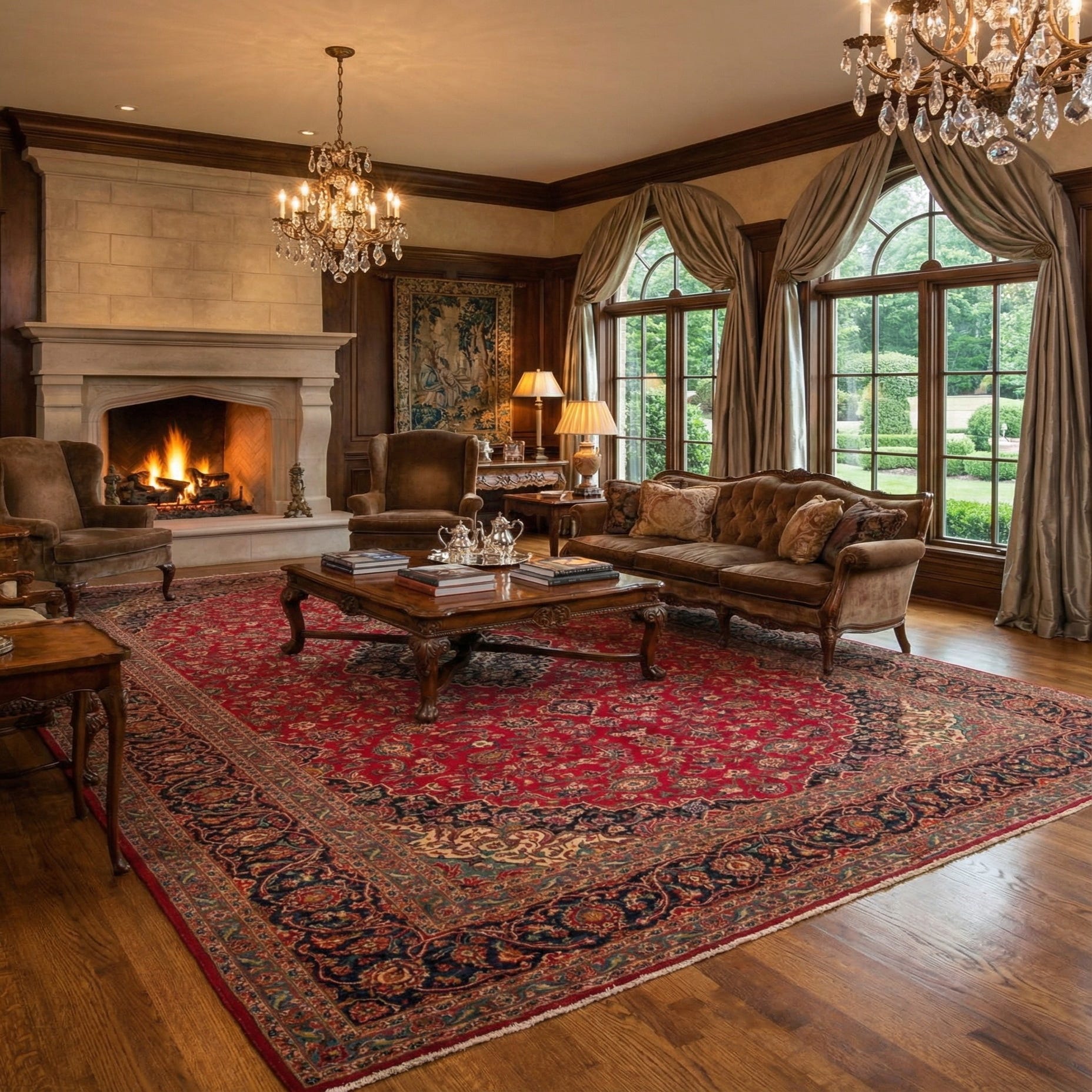 Primary color is Red. Colors in this rug include: Red, Dark Blue, Beige, Green.