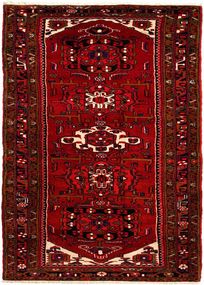 Primary color is Red. Colors in this rug include: Red, Red, Blue, Brown, Cream, Grey, Blue.