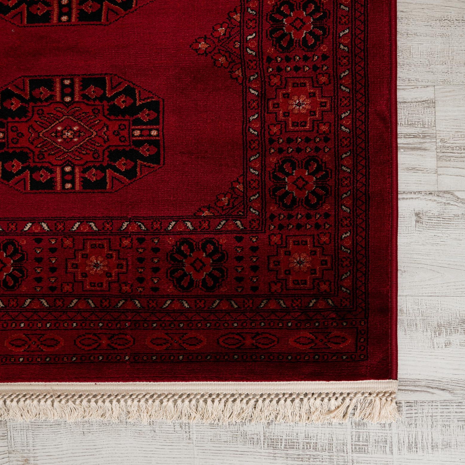 Primary color is Red. Colors in this rug include: Red, Black, Cream, Terracotta.