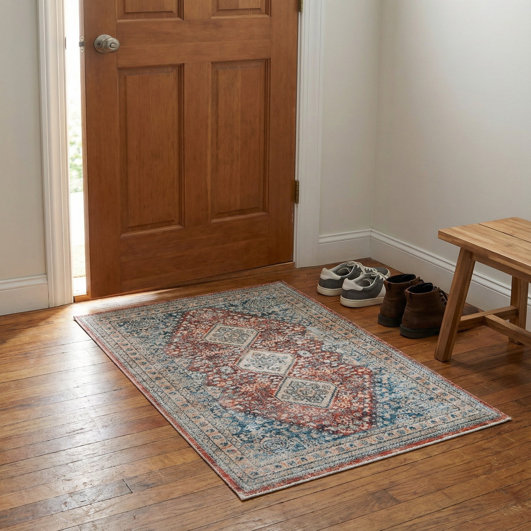 Primary color is Red. Colors in this rug include: Red, Beige, Blue, Ivory, Light Blue.