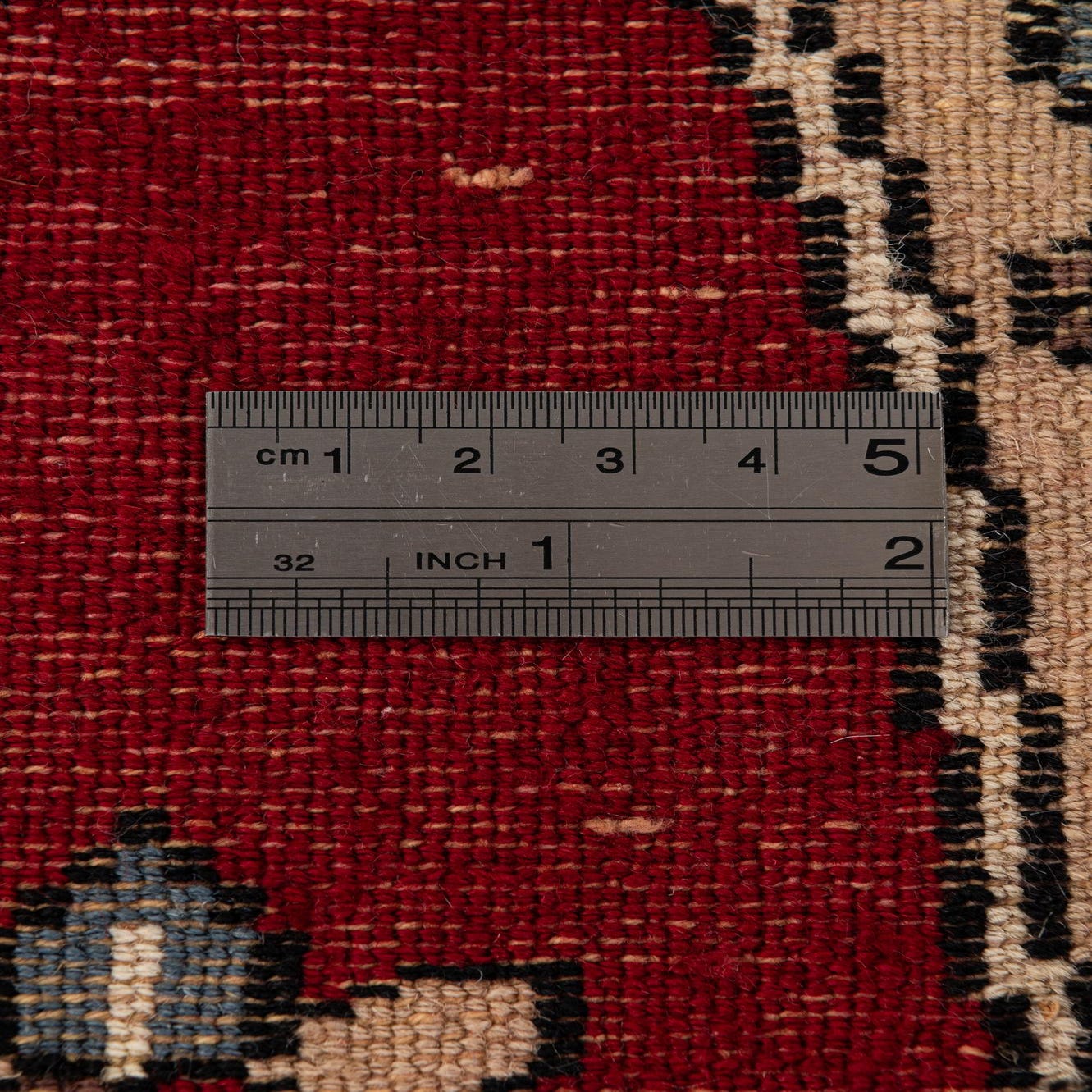 Primary color is Red. Colors in this rug include: Red, Beige, Black, Brown, Blue.