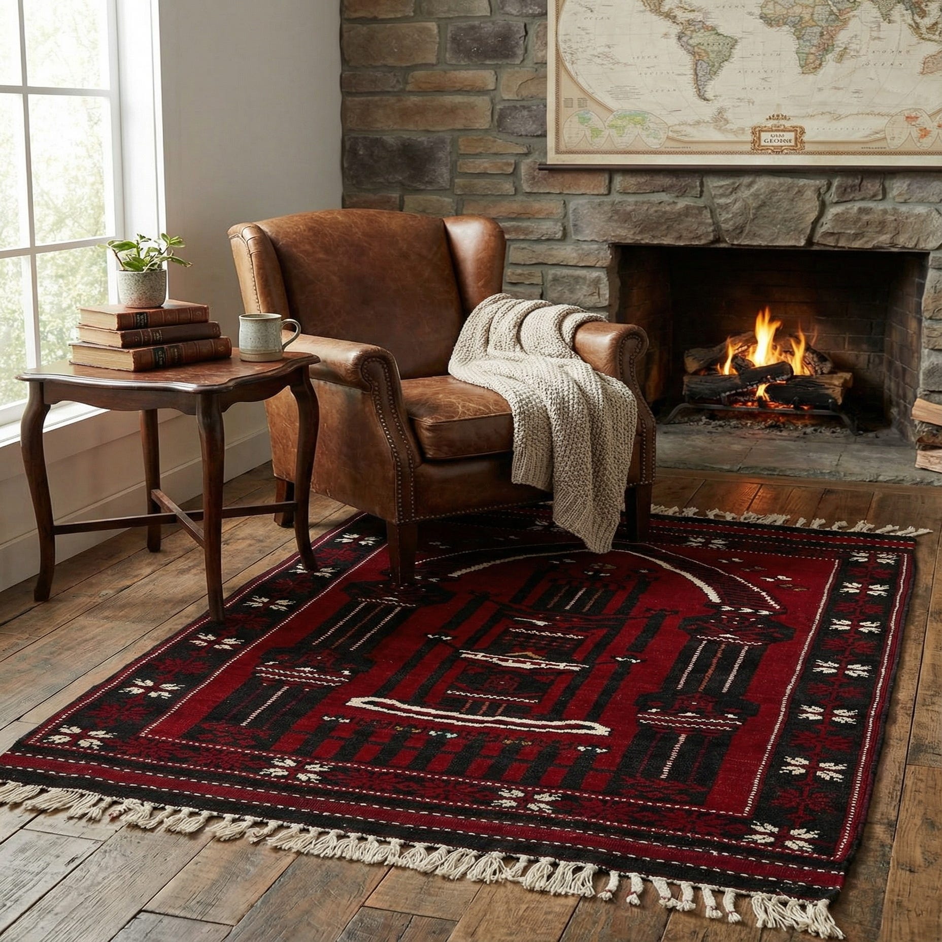Primary color is Red. Colors in this rug include: Red, Black, Ivory.