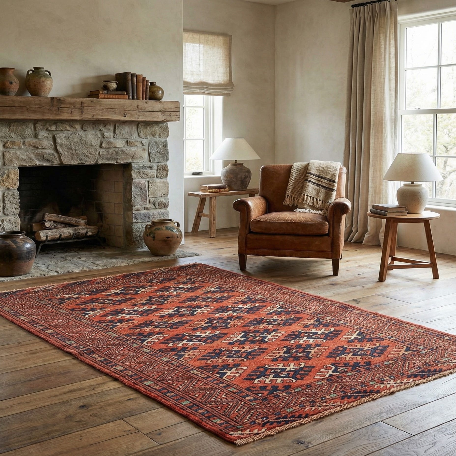 Primary color is Red. Colors in this rug include: Red, Blue, Cream, Brown.