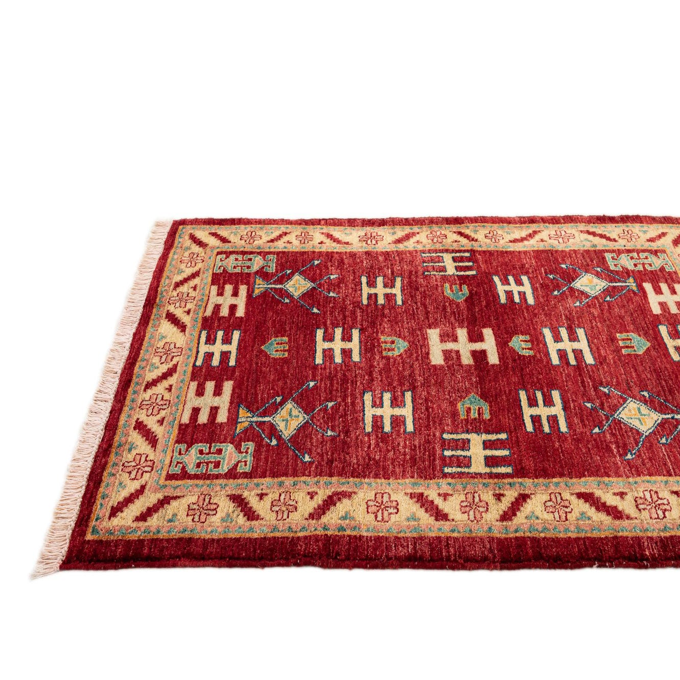 Primary color is Red. Colors in this rug include: Red, Beige, Black, Blue, Brown, Yellow, Green.