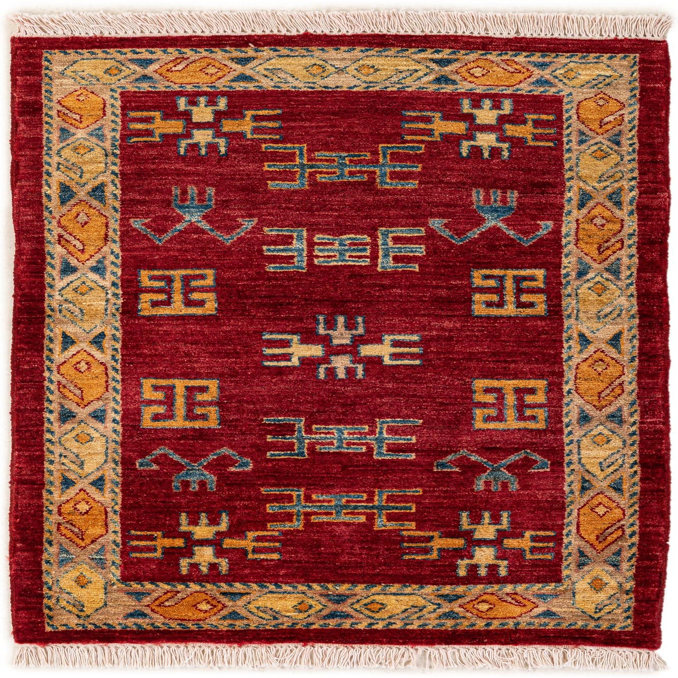 Primary color is Red. Colors in this rug include: Red, Blue, Brown, Light Brown, Yellow.