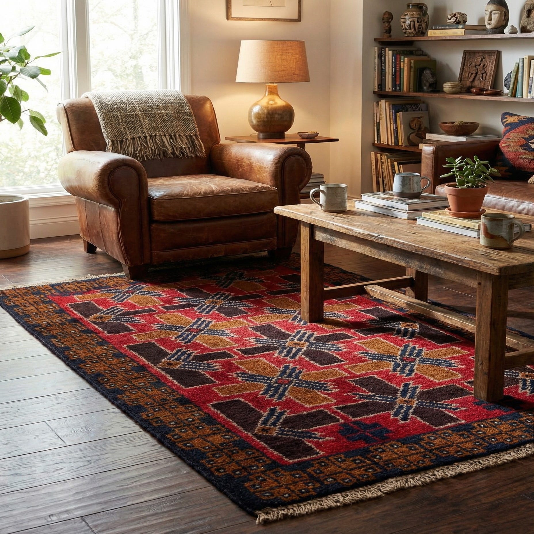 Primary color is Red. Colors in this rug include: Red, Burgundy, Navy Blue, Terracotta.