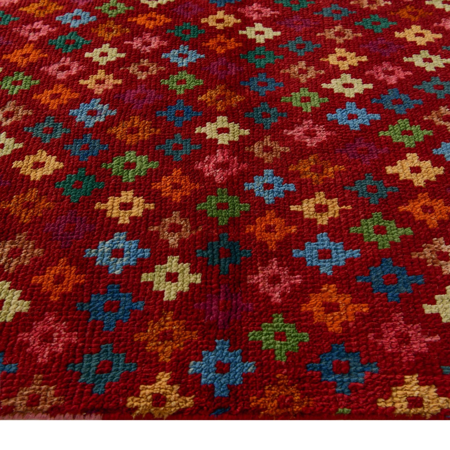 Primary color is Red. Colors in this rug include: Red, Blue, Green, Ivory, Olive, Orange, Yellow, Pink.