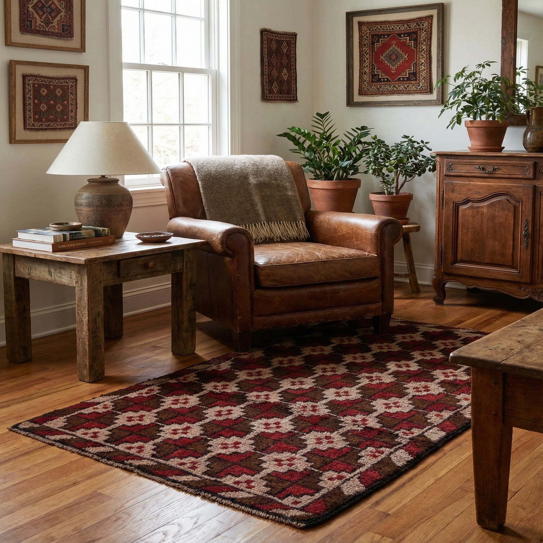 Primary color is Red. Colors in this rug include: Red, Terracotta, Light Brown.