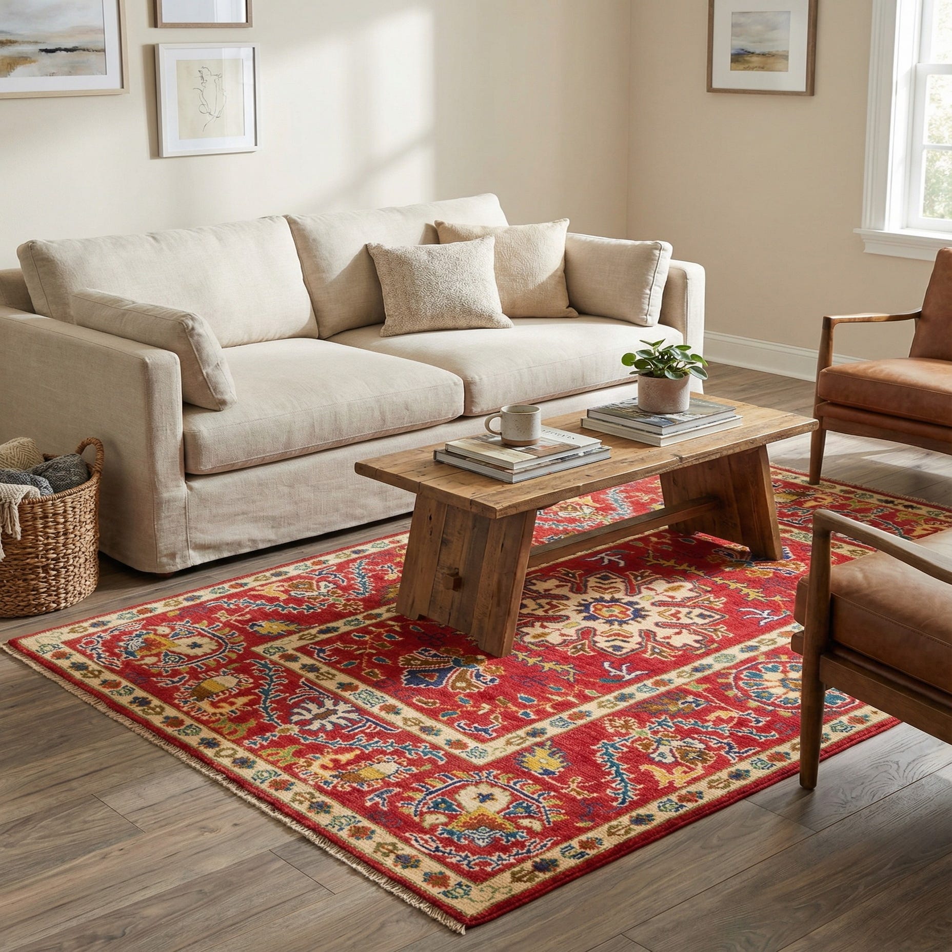 Primary color is Red. Colors in this rug include: Red, Blue, Brown, Cream, Gold, Green.