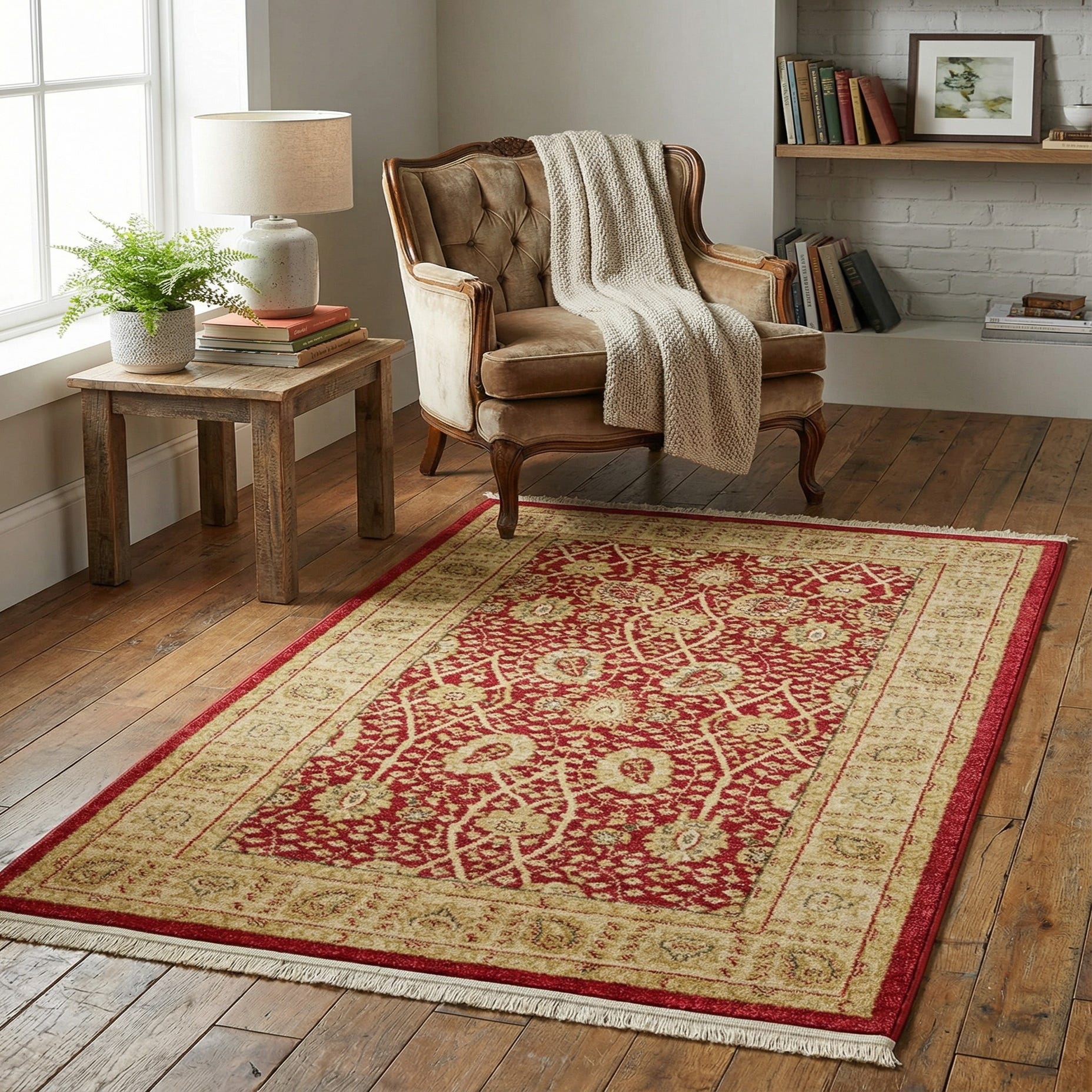 Primary color is Red. Colors in this rug include: Red, Beige, Cream, Light Brown, Light Green.