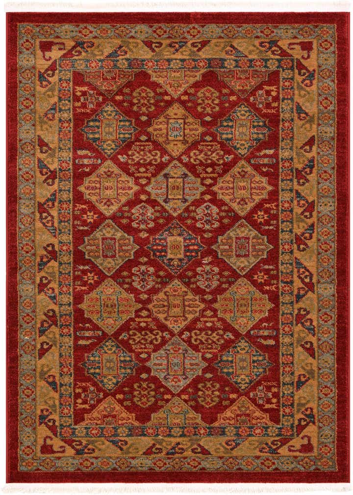Primary color is Red. Colors in this rug include: Red, Beige, Blue, Navy Blue, Light Green, Brown.