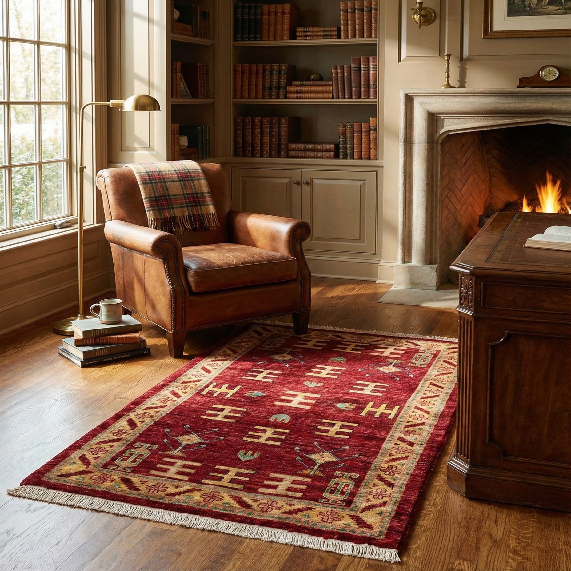 Primary color is Red. Colors in this rug include: Red, Beige, Black, Blue, Brown, Tan, Green.