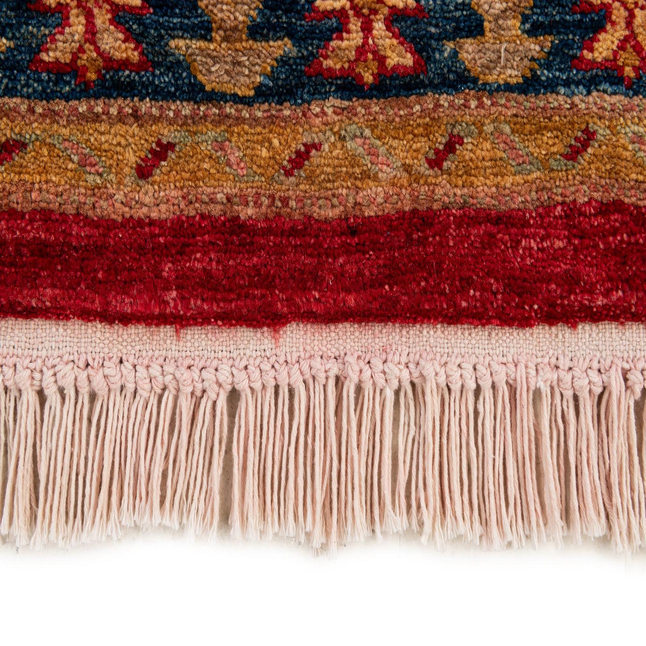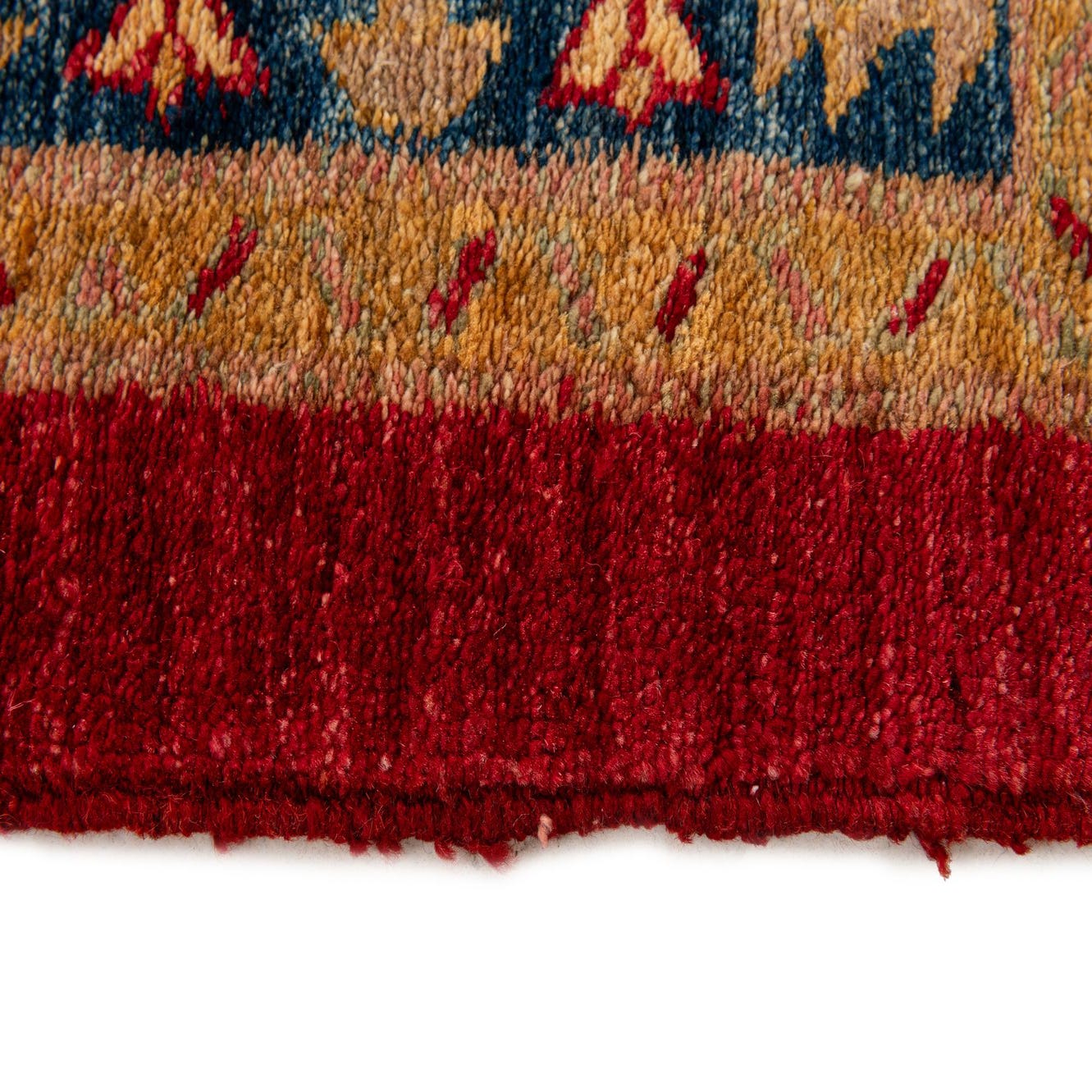 Primary color is Red. Colors in this rug include: Red, Blue, Brown, Navy Blue, Yellow, Green.