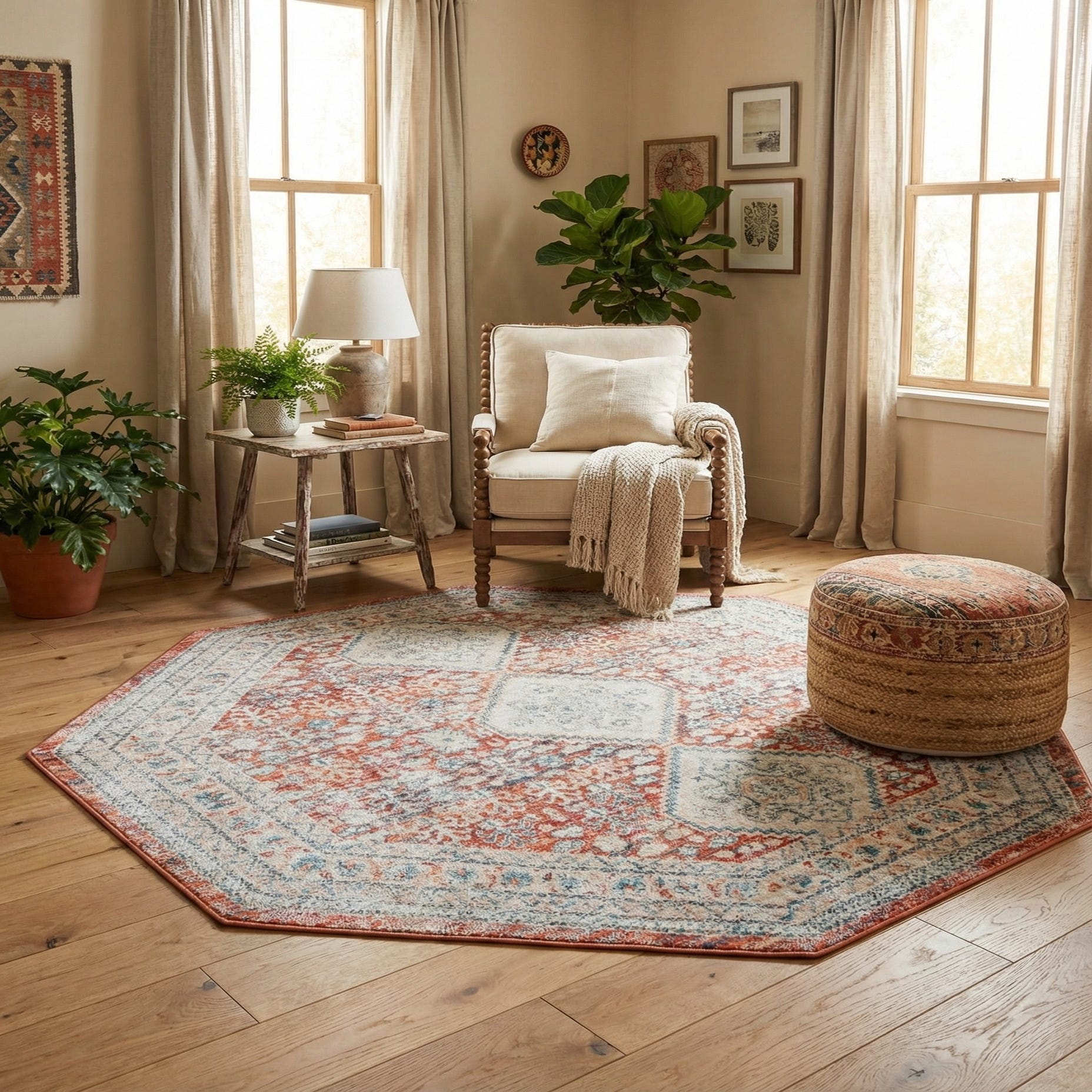 Primary color is Red. Colors in this rug include: Red, Beige, Blue, Light Blue, Ivory.