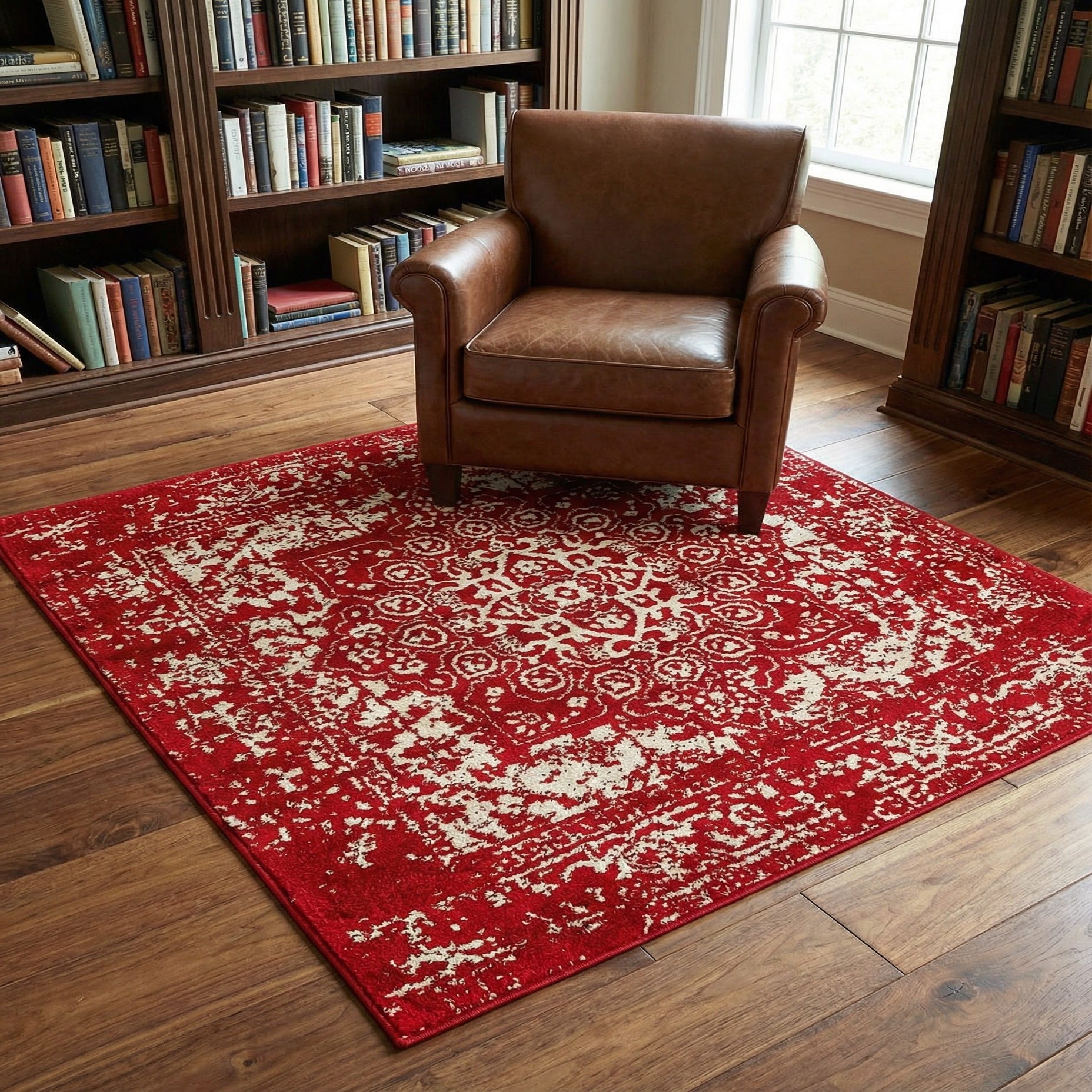 Primary color is Red. Colors in this rug include: Red, Ivory.