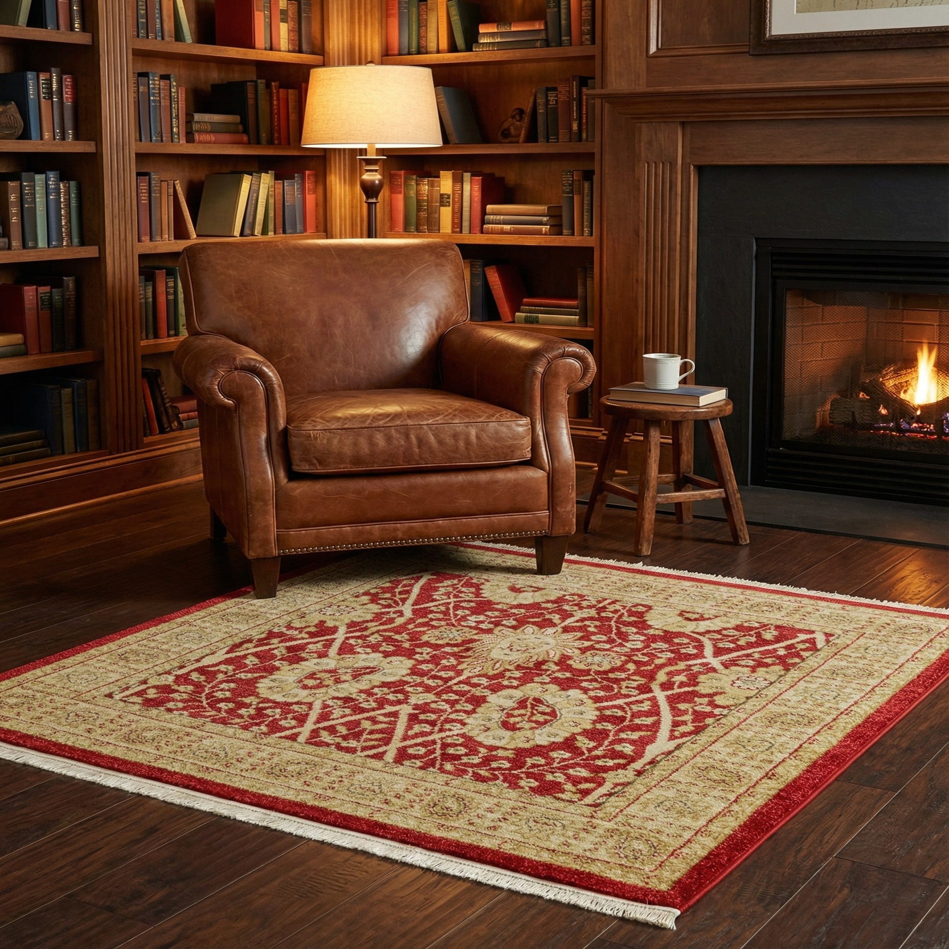 Primary color is Red. Colors in this rug include: Red, Beige, Cream, Light Brown, Light Green.