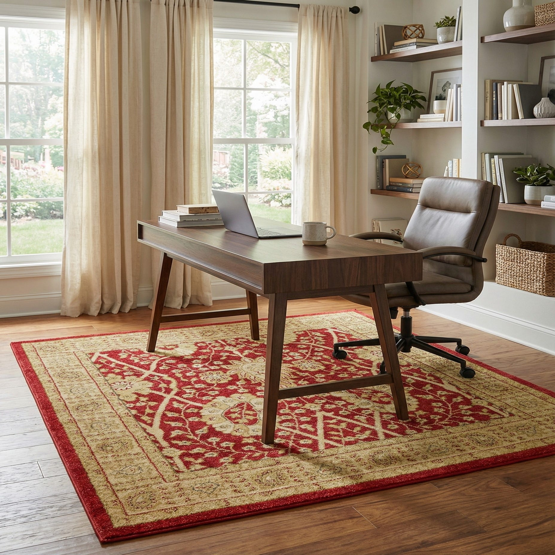 Primary color is Red. Colors in this rug include: Red, Beige, Cream, Light Brown, Light Green.
