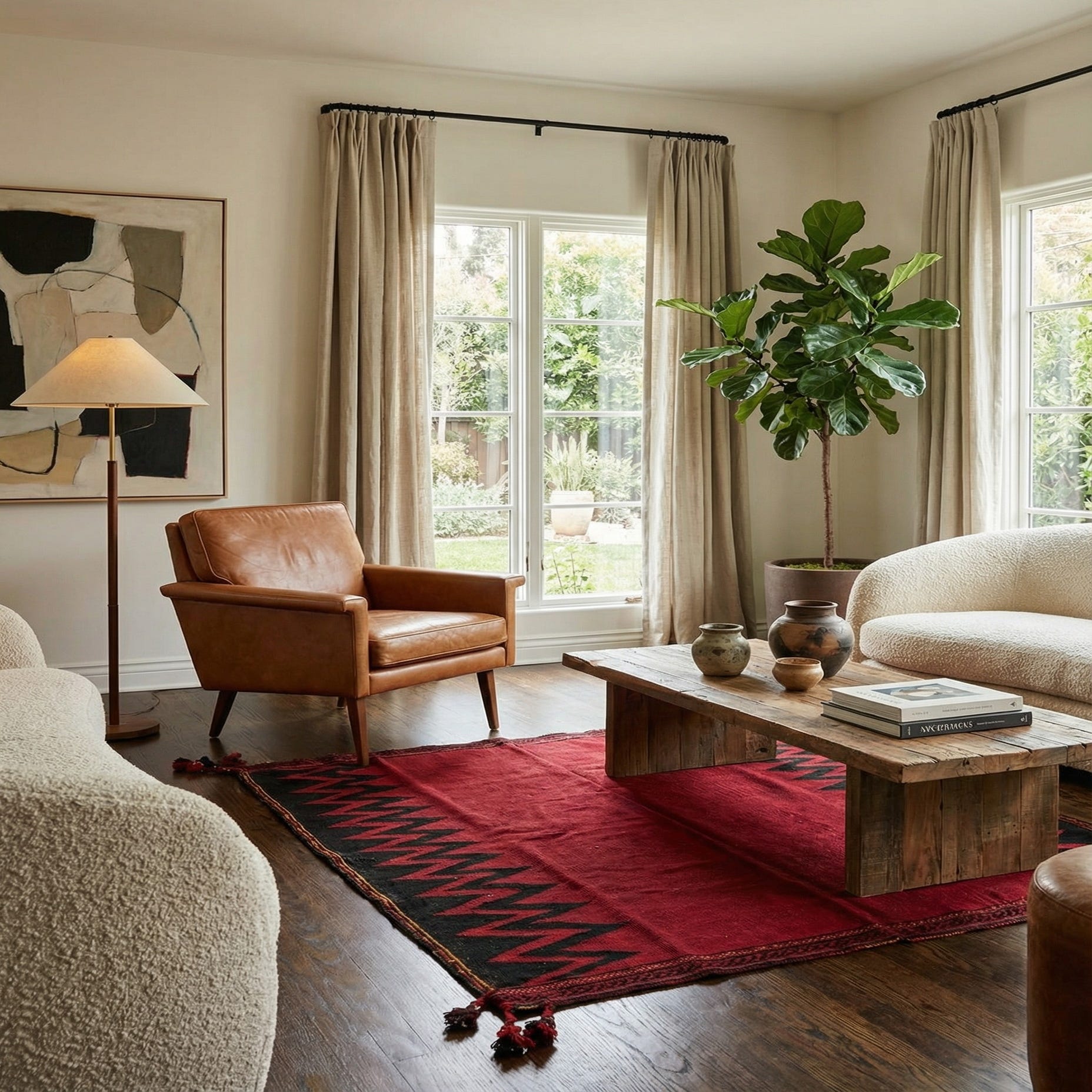 Primary color is Red. Colors in this rug include: Red, Black, Orange.