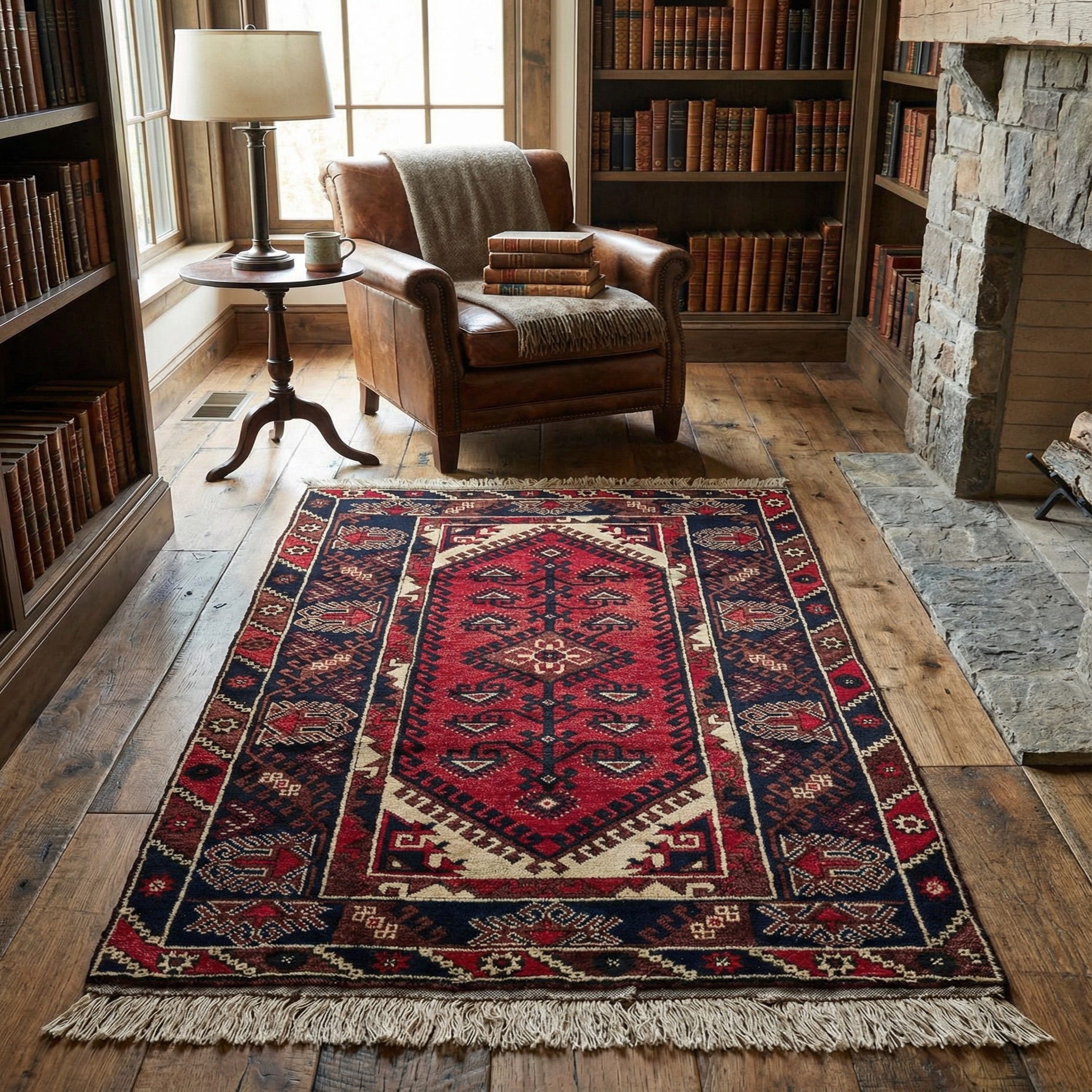 Primary color is Red. Colors in this rug include: Red, Black, Brown, Ivory, Burgundy.
