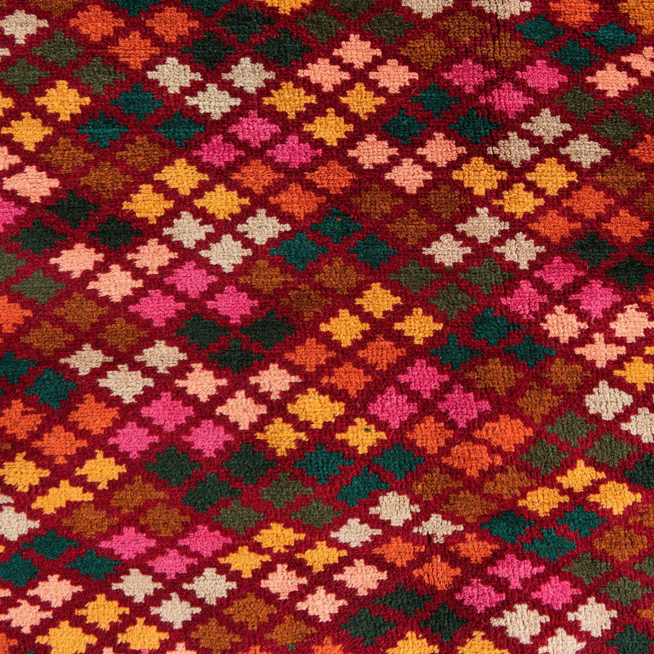 Primary color is Red. Colors in this rug include: Red, Brown, Green, Orange, Yellow, Pink, Light Green.