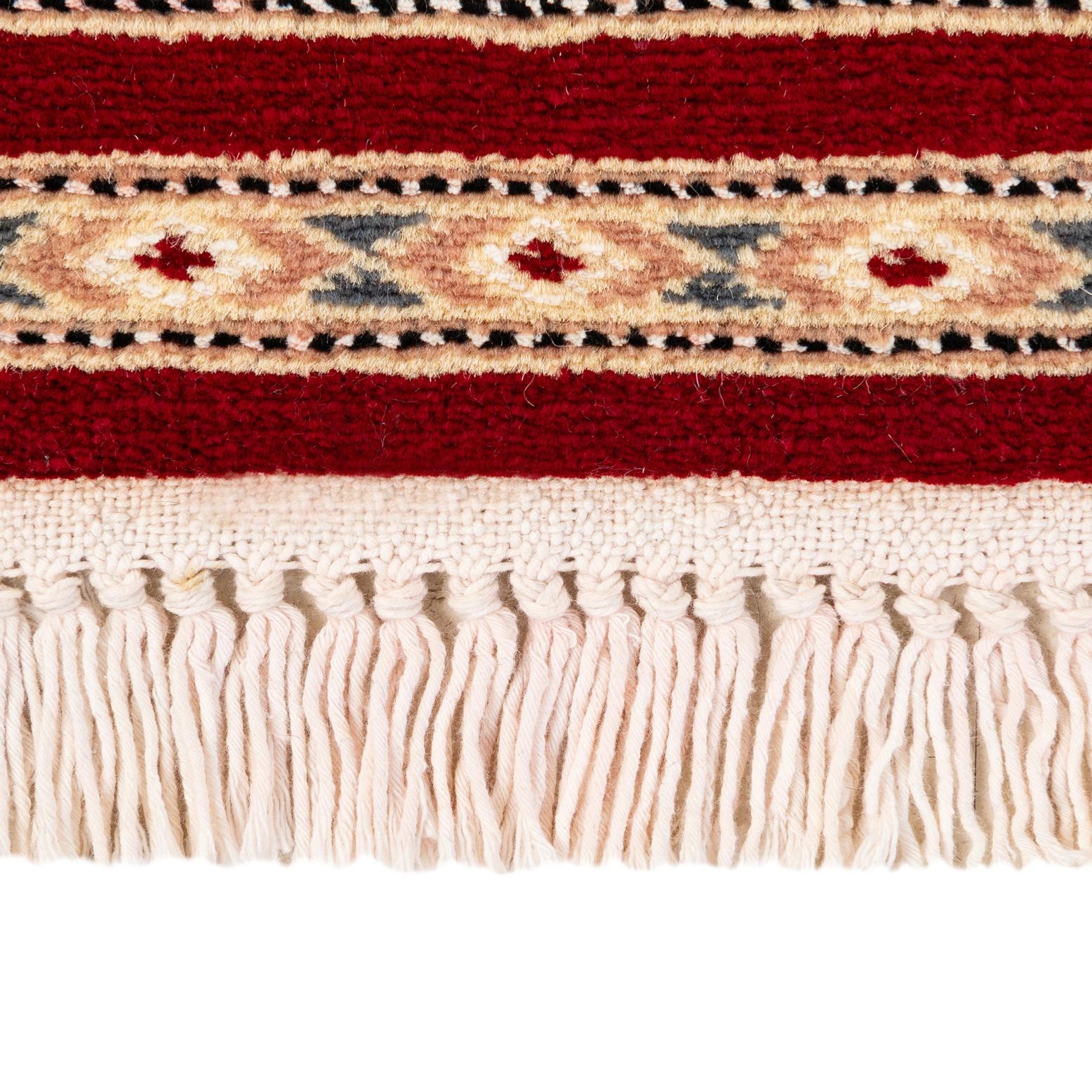 Primary color is Red. Colors in this rug include: Red, Beige, Black, Gray, Peach.
