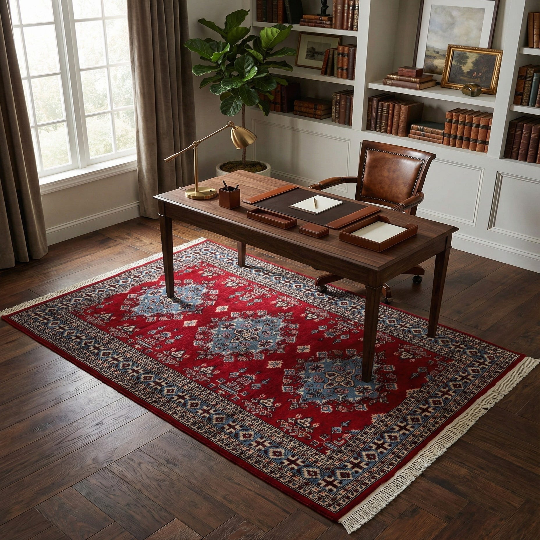 Primary color is Red. Colors in this rug include: Red, Beige, Blue, Black, Light Blue, Ivory.