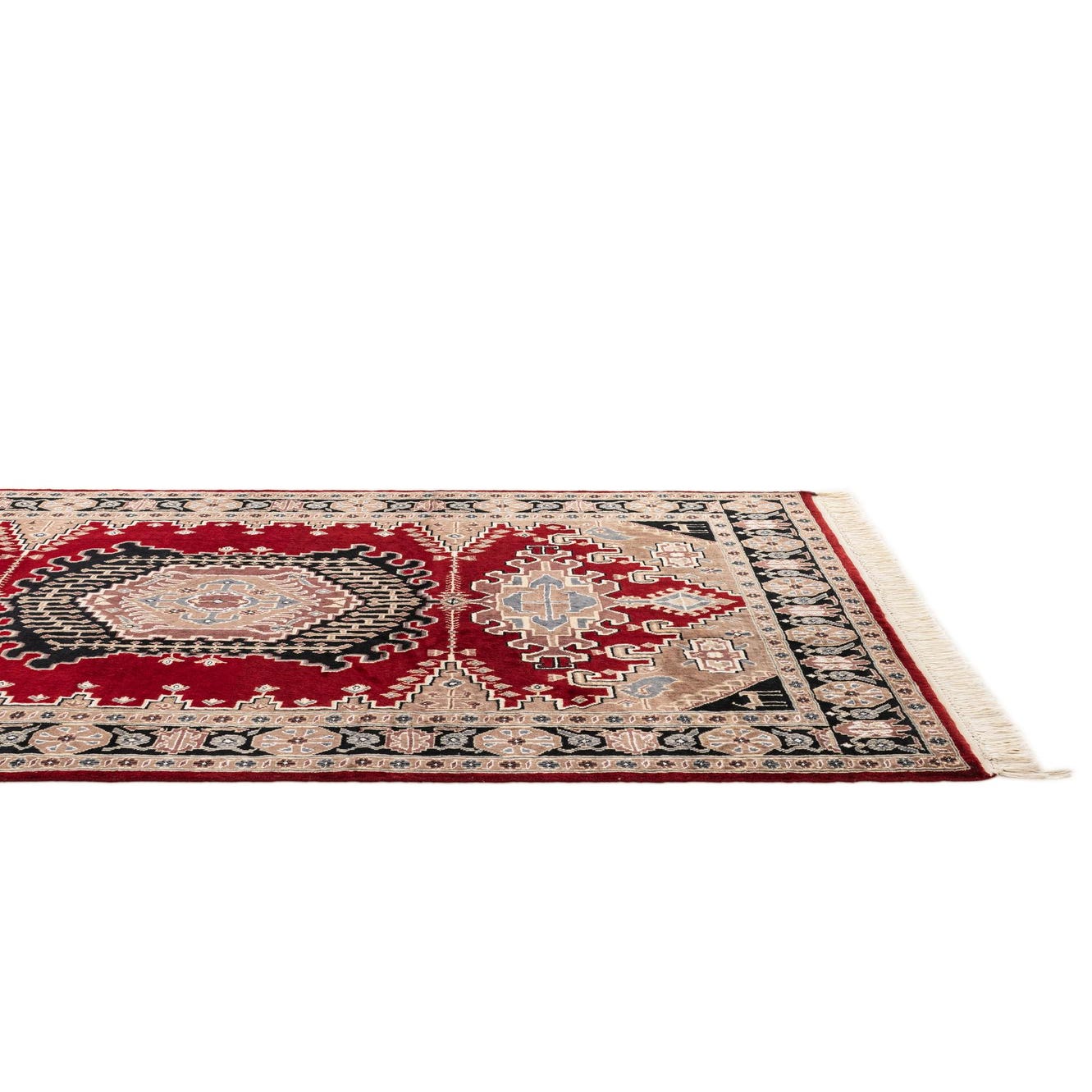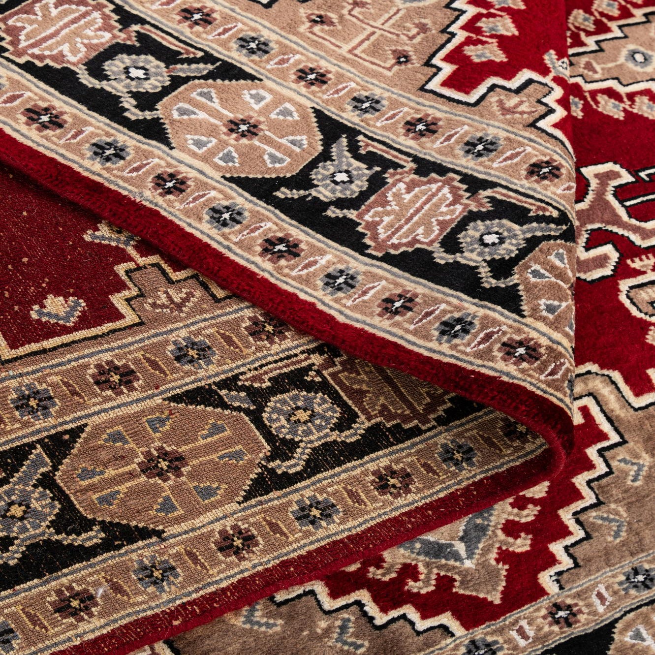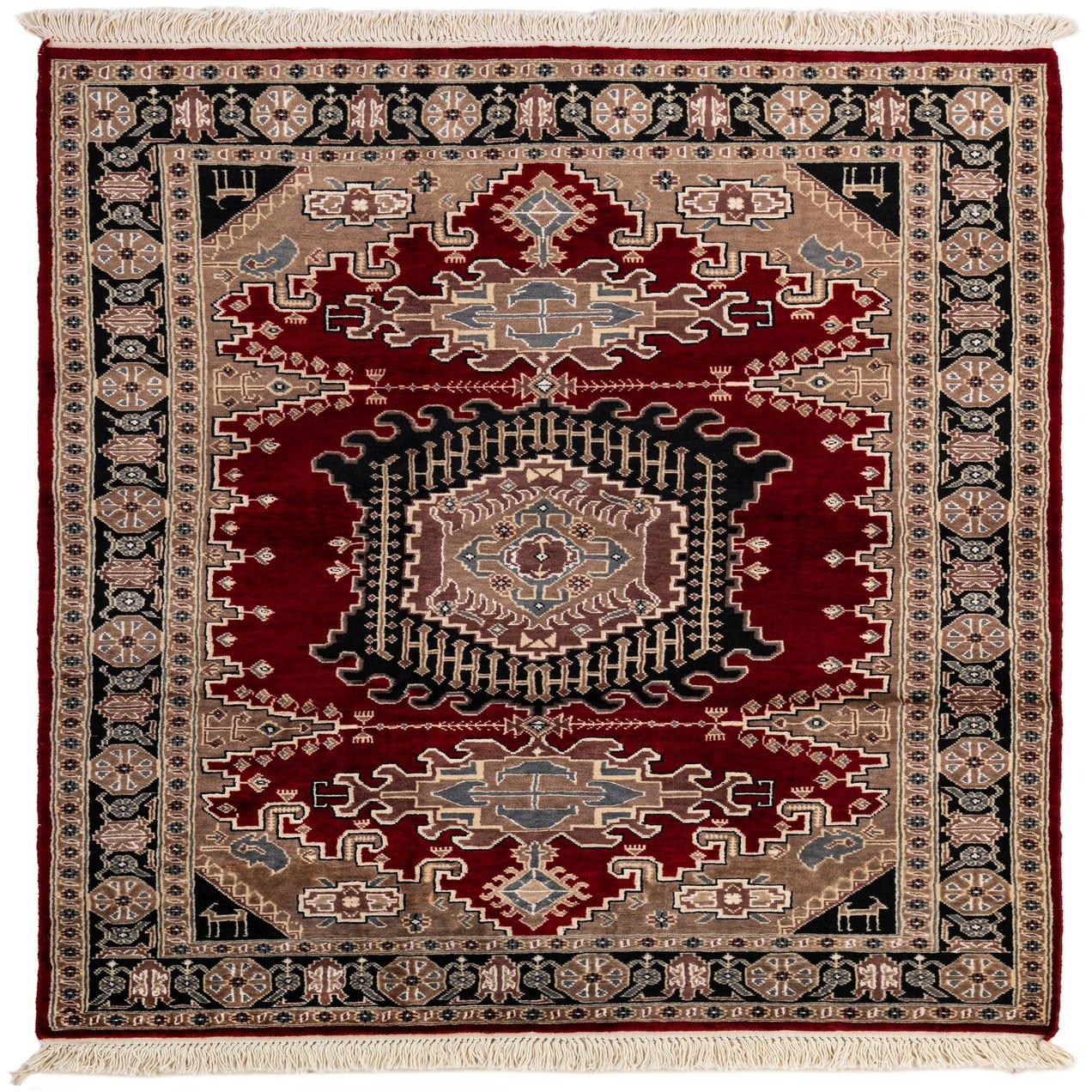 Primary color is Red. Colors in this rug include: Red, Beige, Black, Brown, Ivory, Gray.