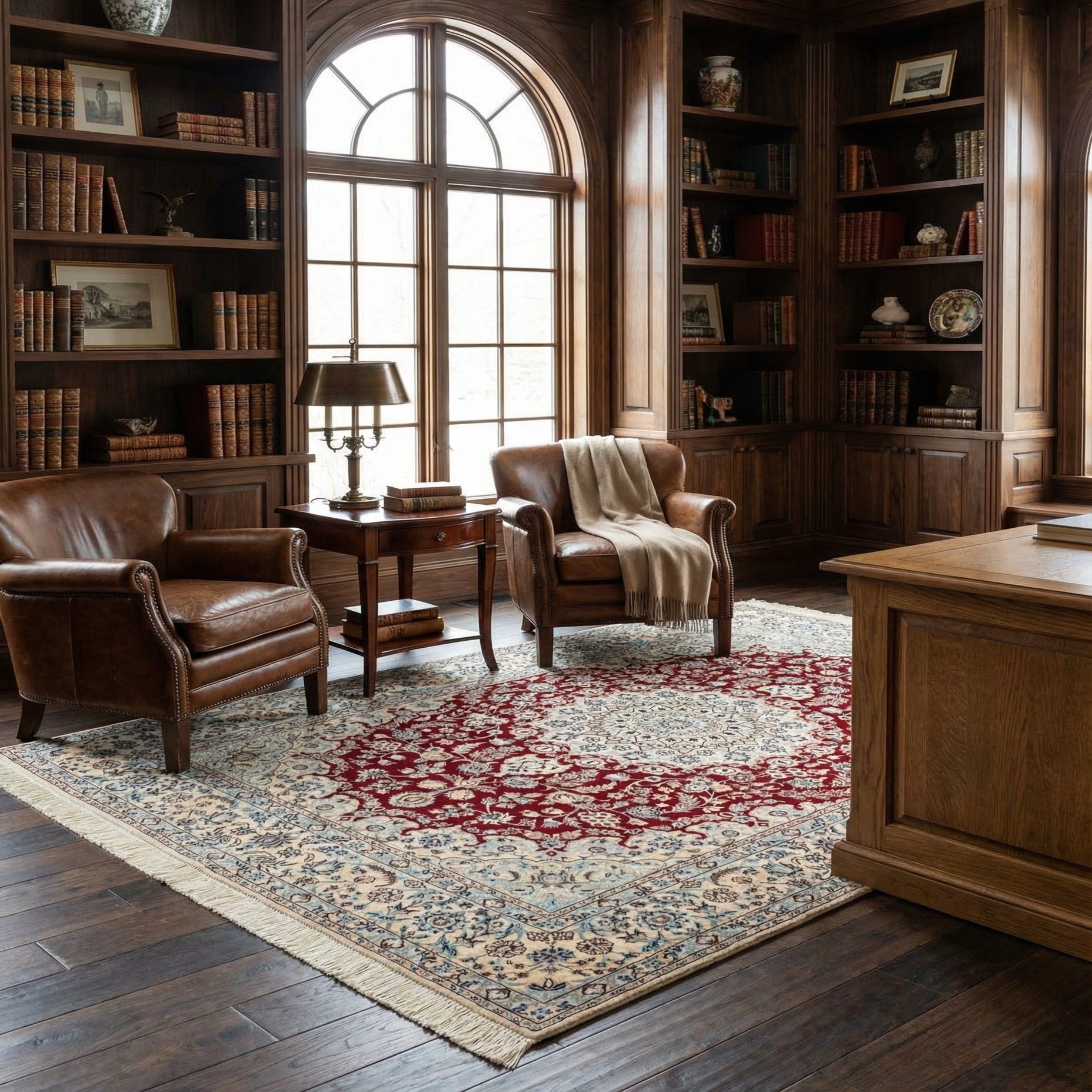 Primary color is Red. Colors in this rug include: Red, Beige.