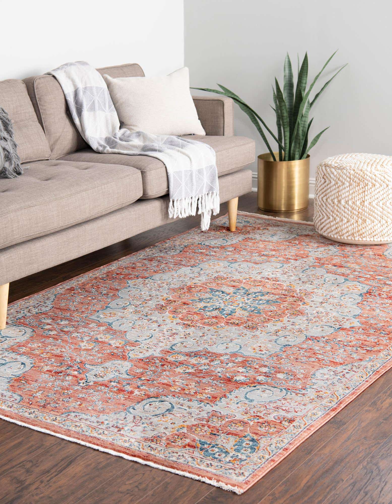 Primary color is Red. Colors in this rug include: Red, Ivory, Light Blue, Rust Red, Terracotta.