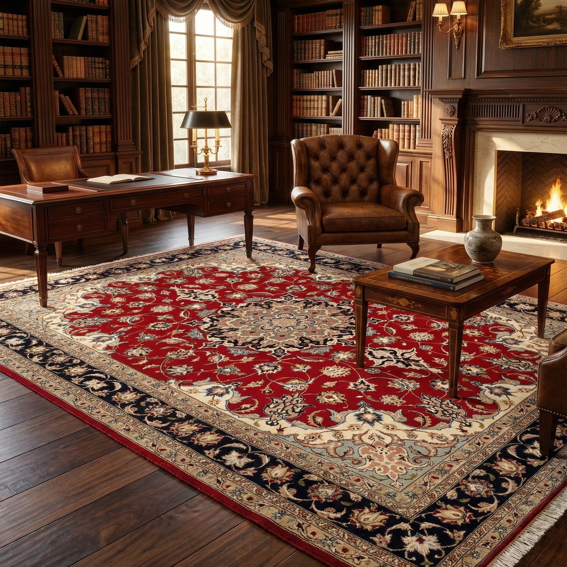 Primary color is Red. Colors in this rug include: Red, Red, Cream, Dark Blue, Blue, Brown, Grey.