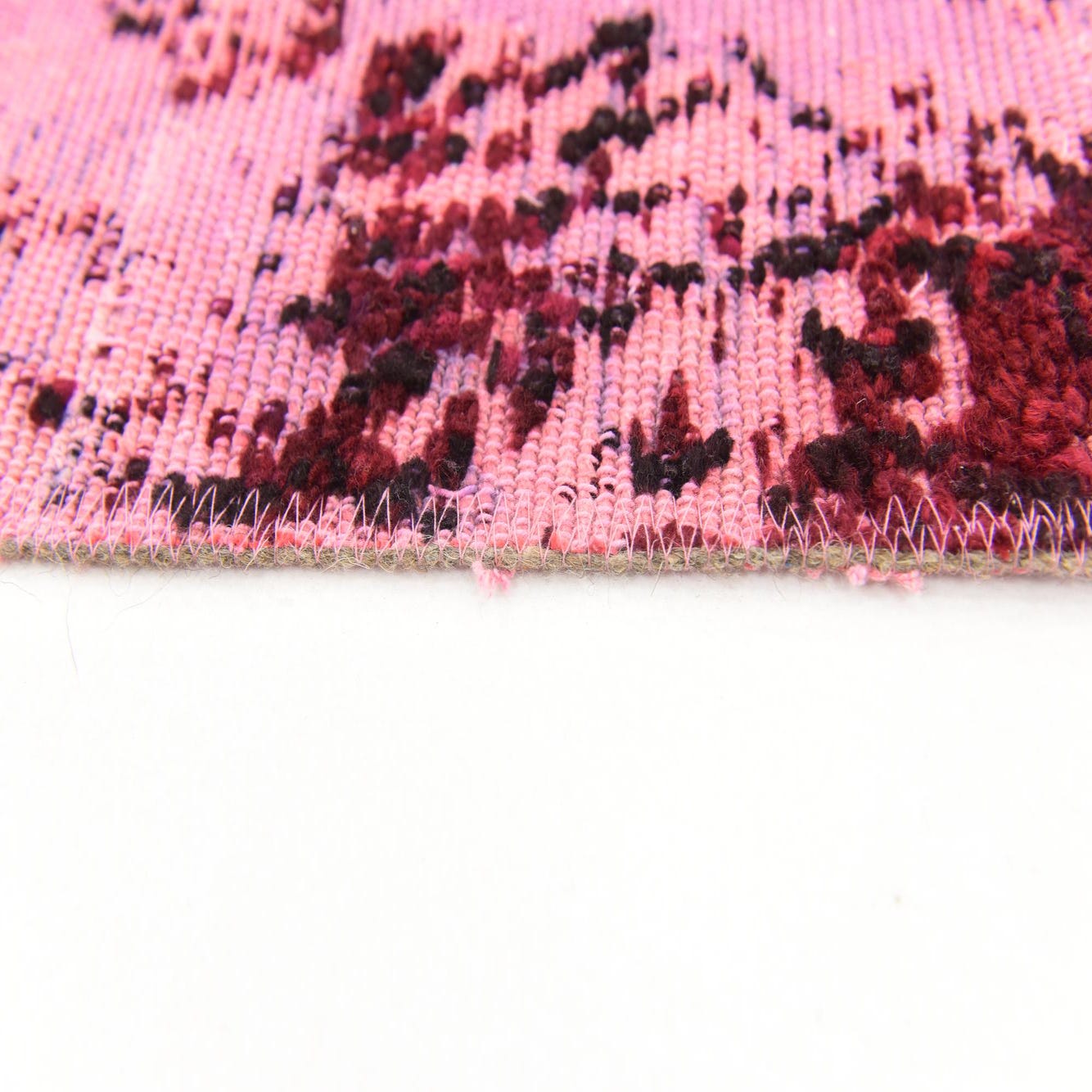 Primary color is Red. Colors in this rug include: Red, Black, Navy Blue, Puce, Pink.
