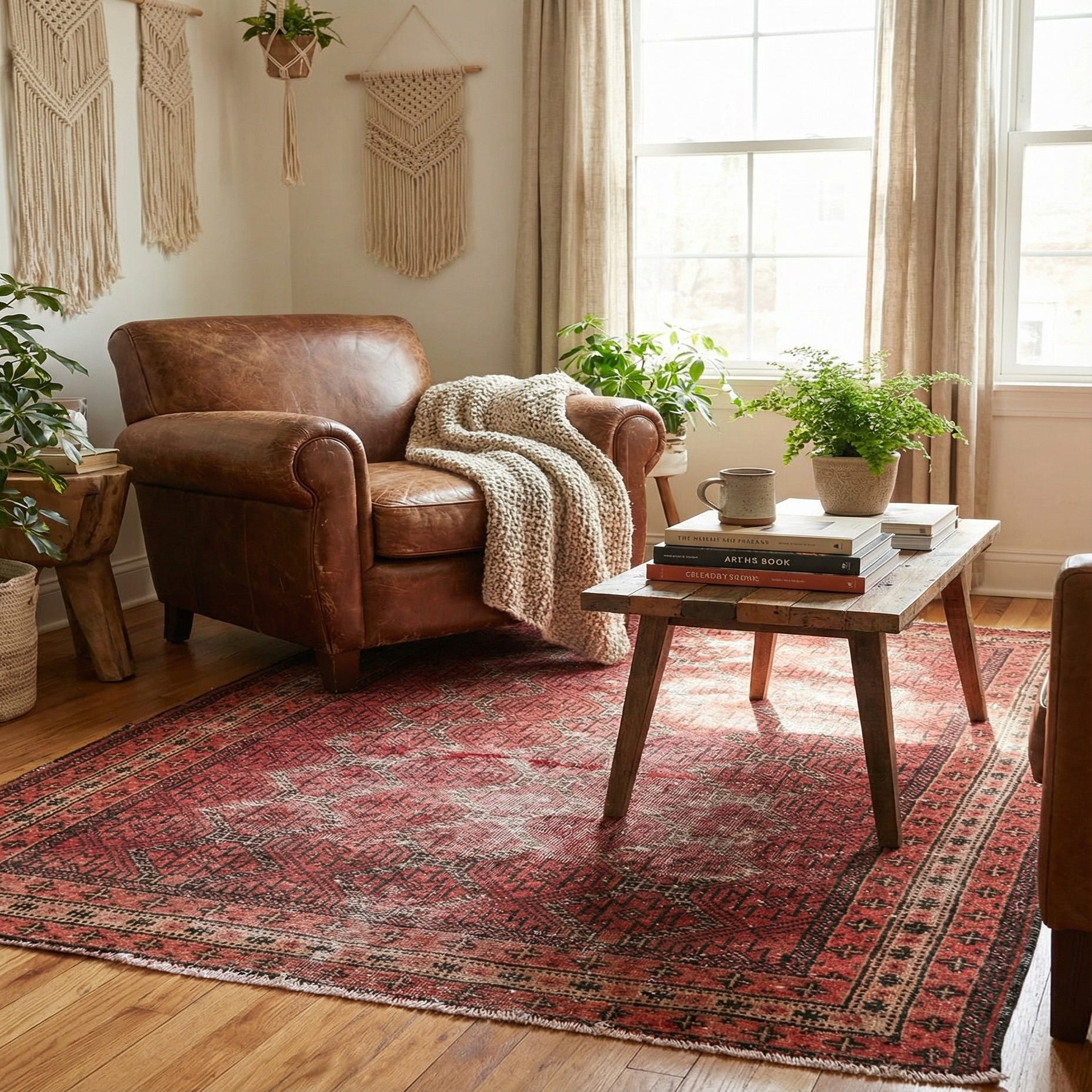 Primary color is Red. Colors in this rug include: Red, Brown, Ivory.