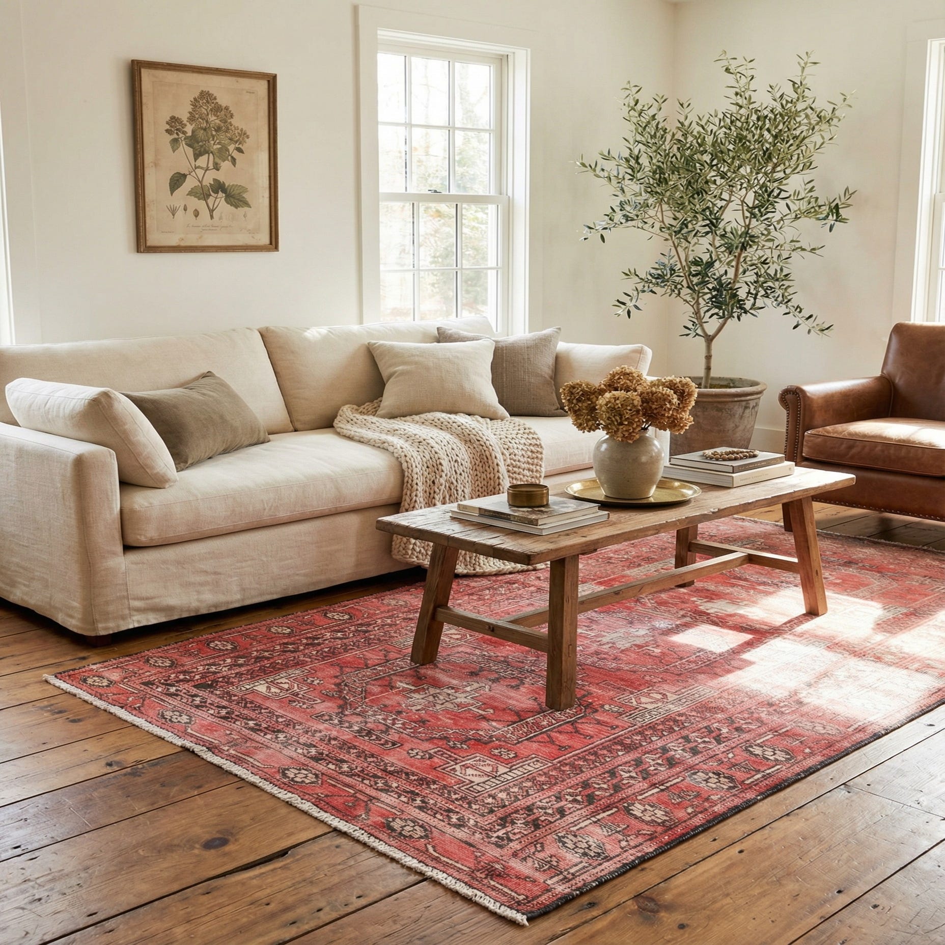 Primary color is Red. Colors in this rug include: Red, Brown, Beige.
