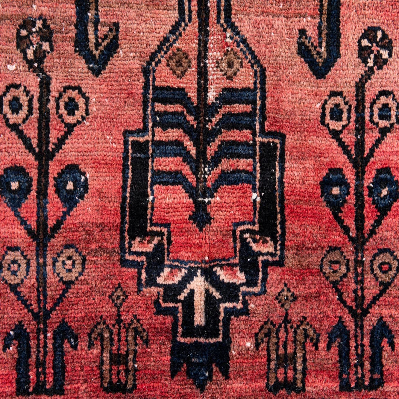 Primary color is Red. Colors in this rug include: Red, Brown, Navy Blue, Ivory.