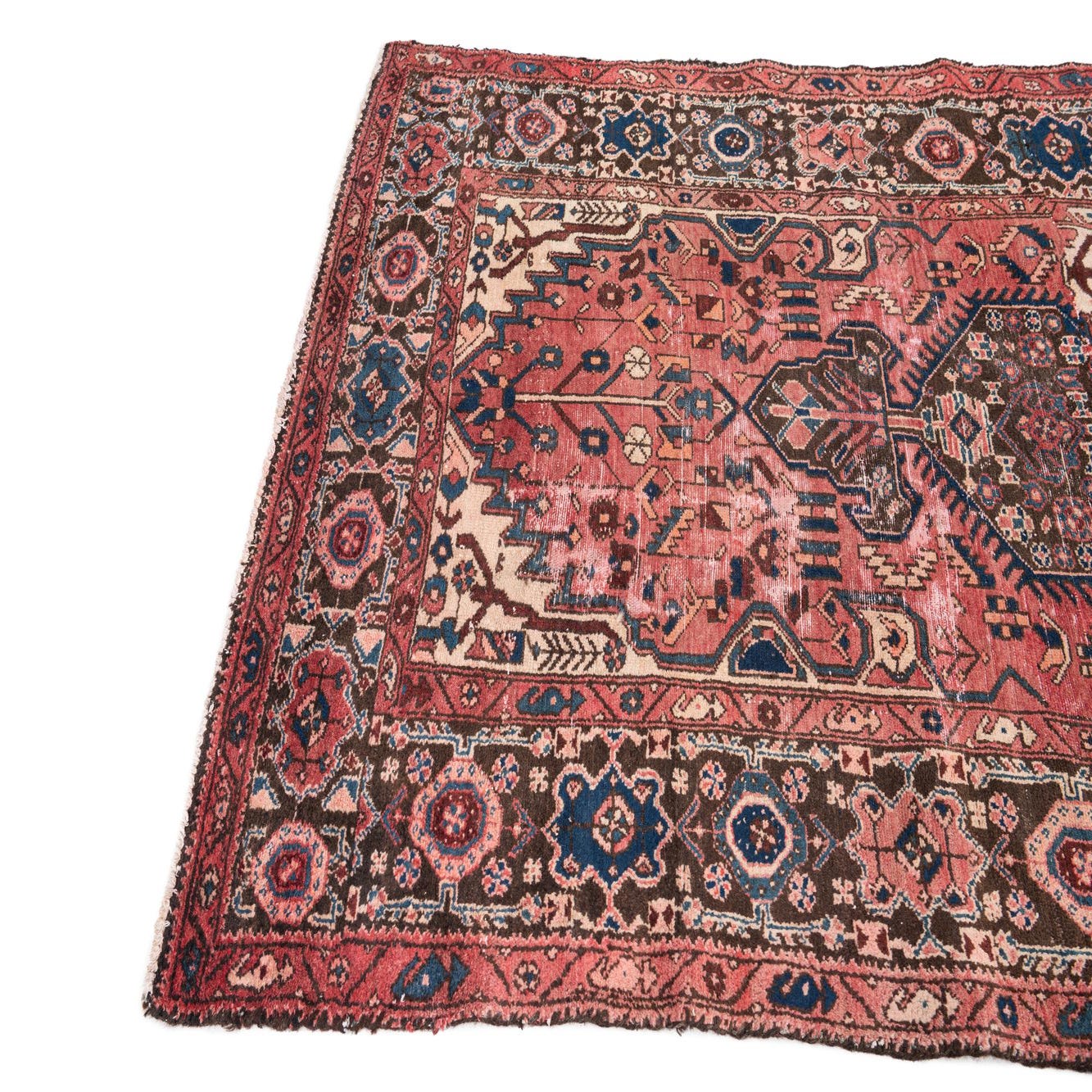Primary color is Red. Colors in this rug include: Red, Brown, Ivory, Navy Blue, Pink.