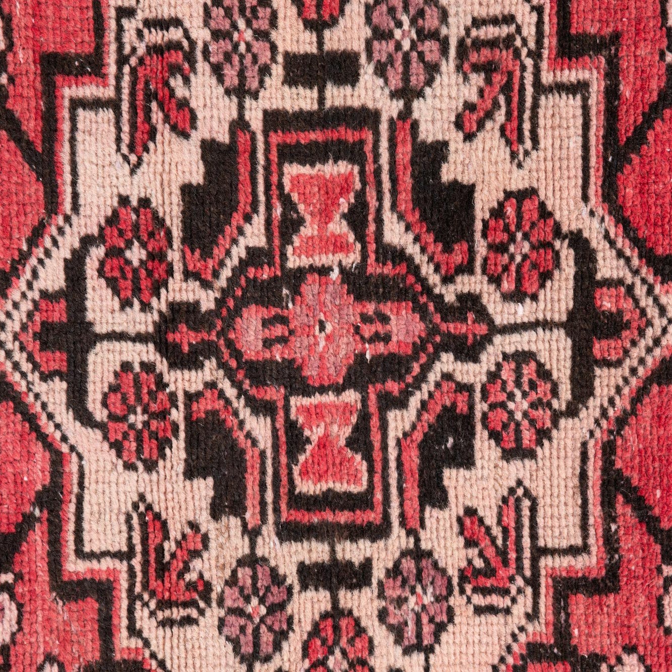 Primary color is Red. Colors in this rug include: Red, Black, Ivory.