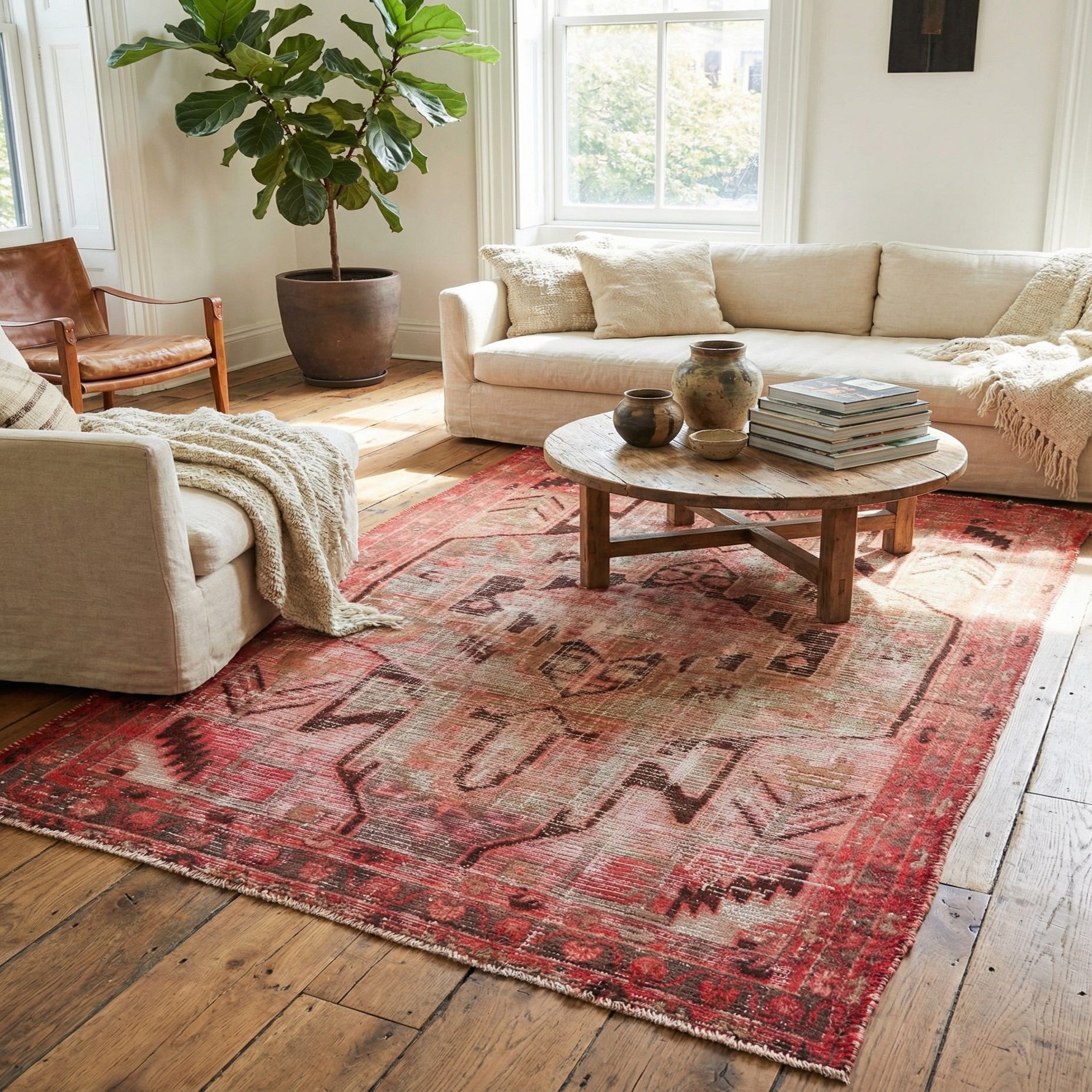 Primary color is Red. Colors in this rug include: Red, Brown, Burgundy, Beige.