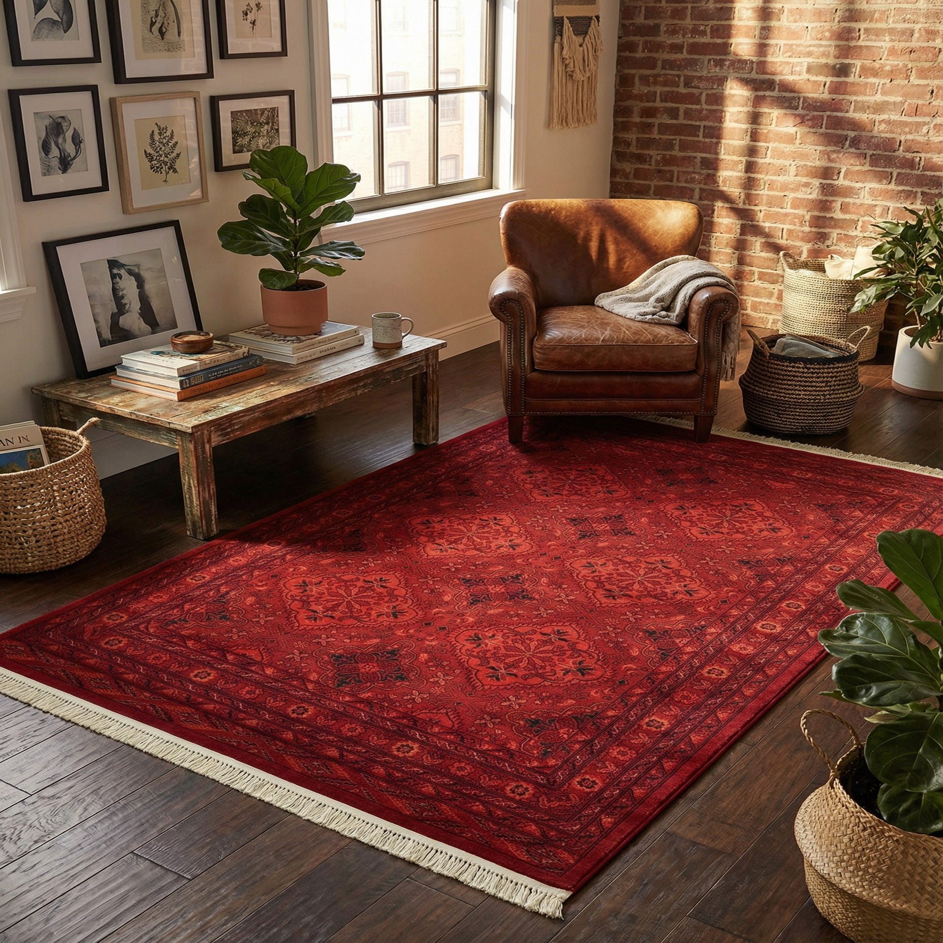 Primary color is Red. Colors in this rug include: Red, Black, Cream, Terracotta.