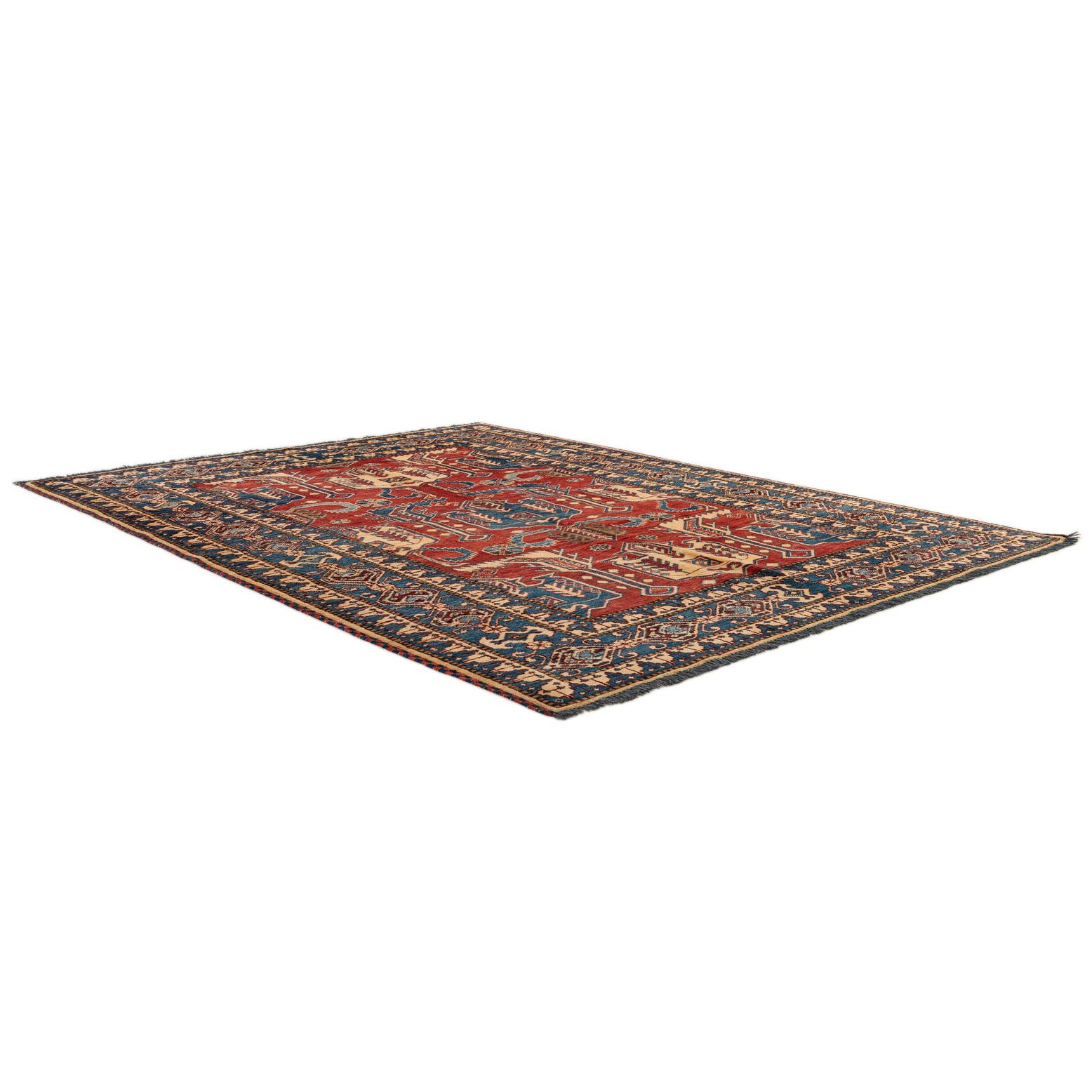 Primary color is Red. Colors in this rug include: Red, Blue, Brown, Navy Blue.