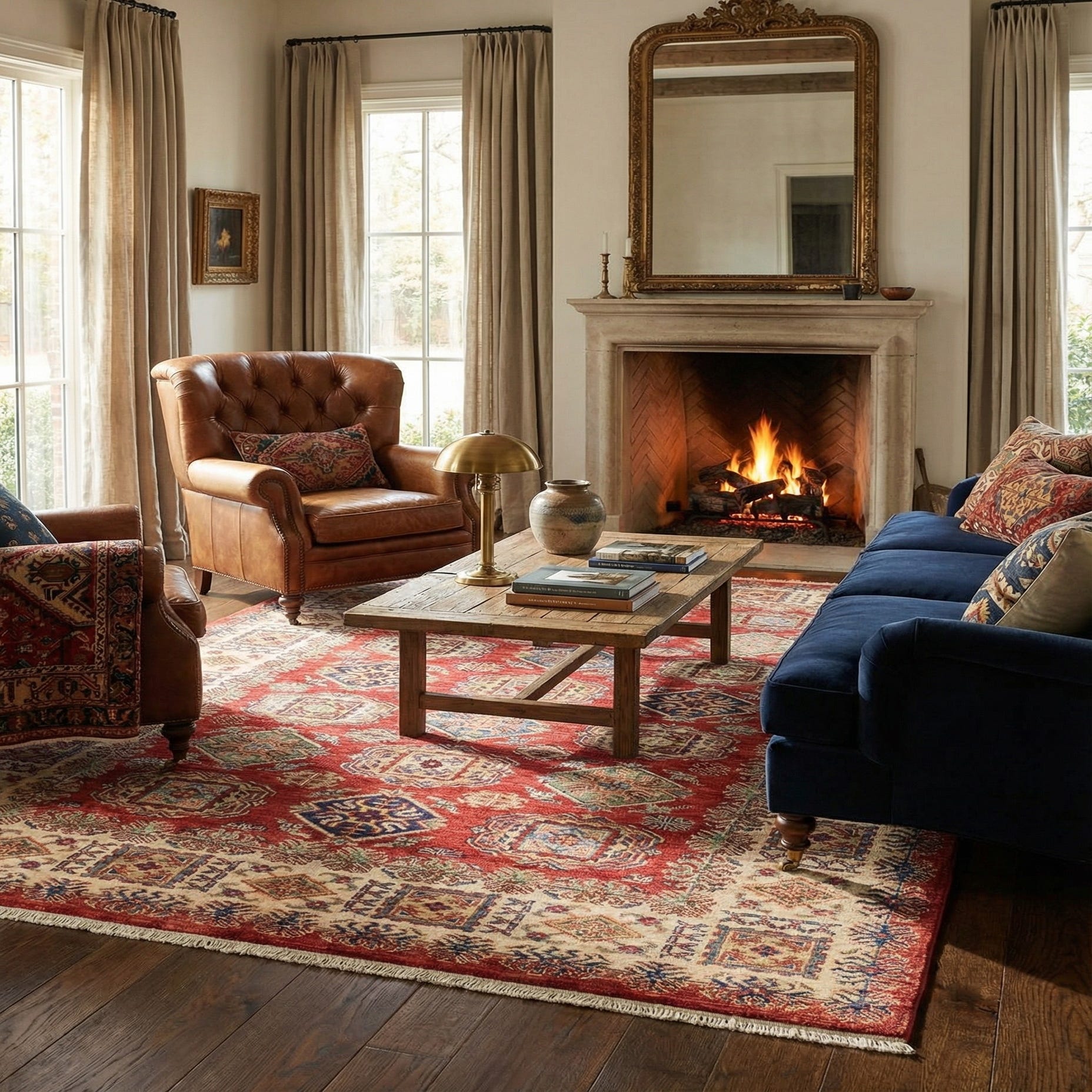 Primary color is Red. Colors in this rug include: Red, Black, Blue, Brown, Cream, Green, Navy Blue, Orange, Peach.